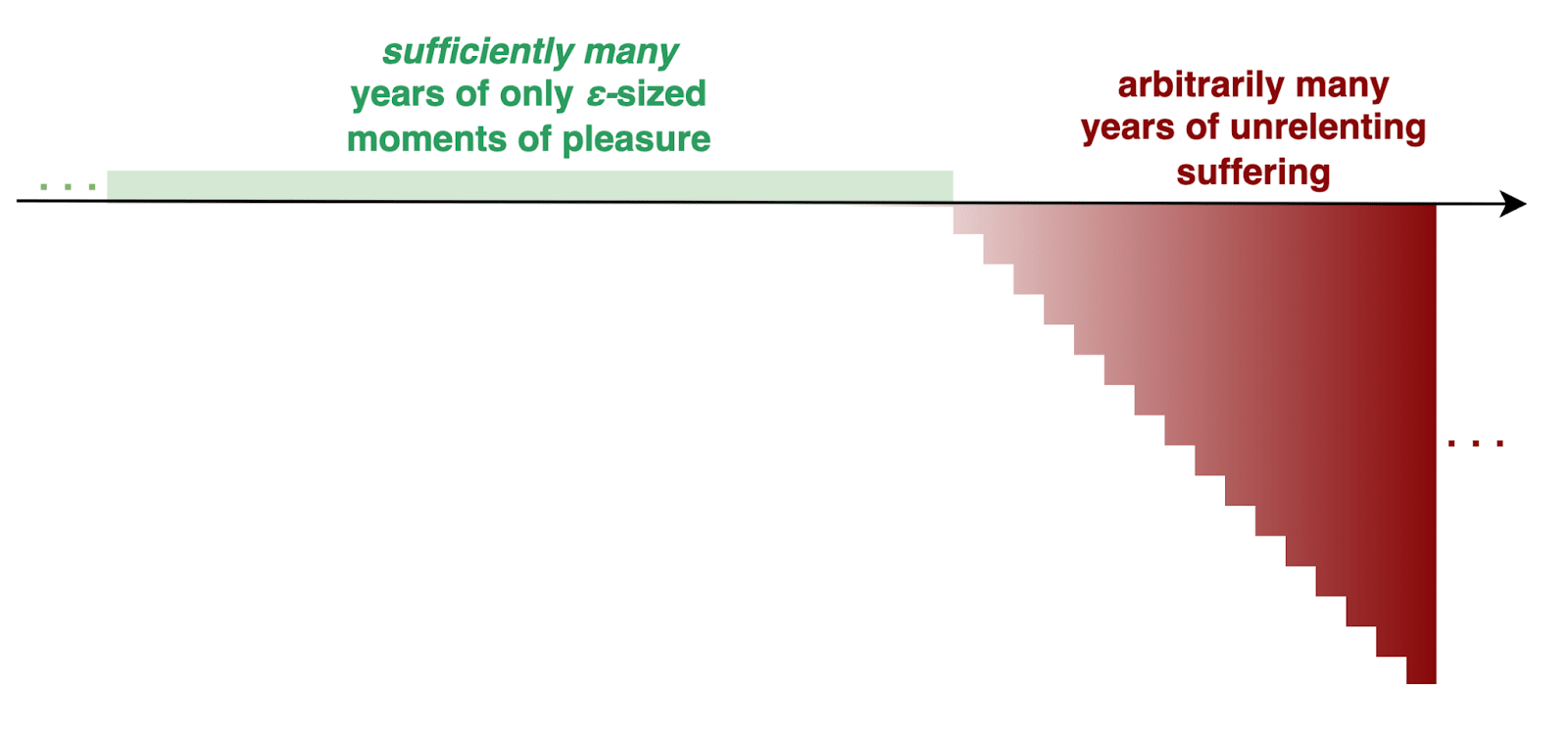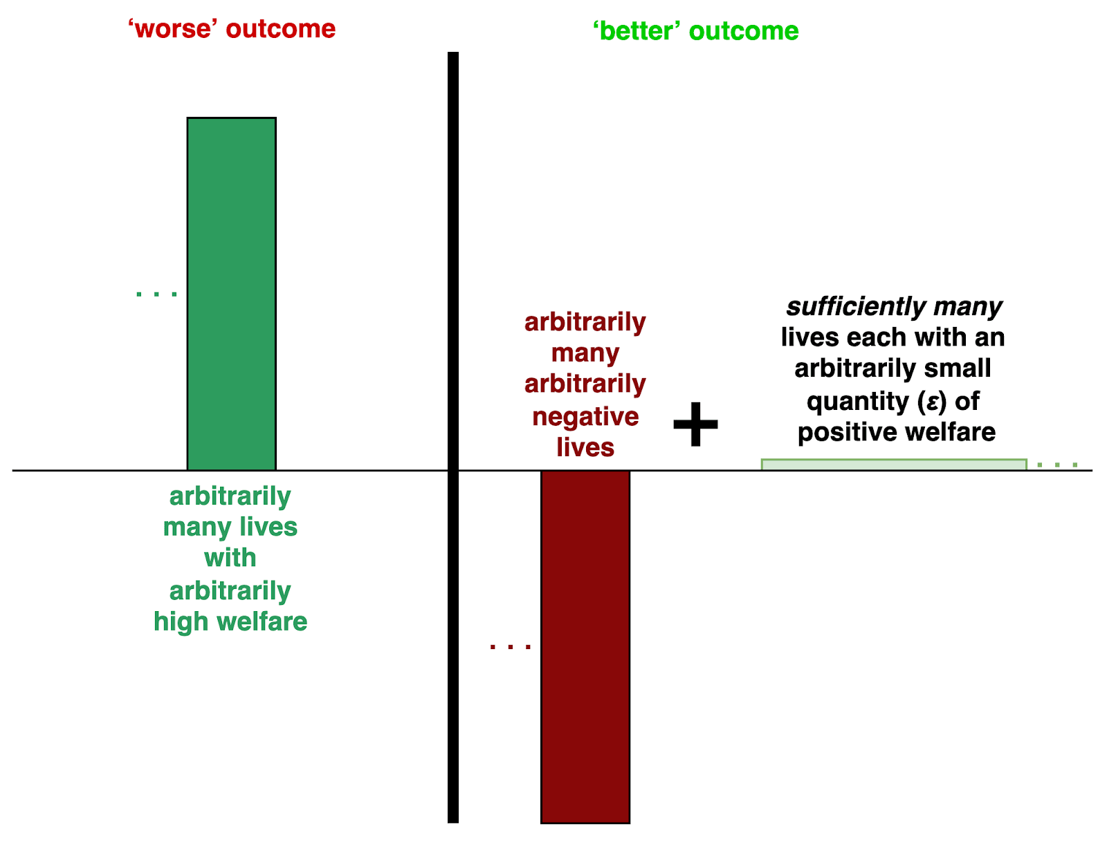 | A population of arbitrarily many lives with arbitrarily high welfare is worse than a population of arbitrarily many arbitrarily negative lives plus sufficiently many “ε-lives”[1] that each have an arbitrarily small quantity of positive welfare (Figure 4.1). |