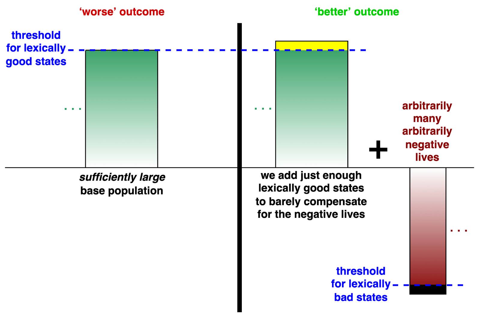 | It is a net improvement to add arbitrarily many non-lexically bad states (e.g. wholly bearable suffering) as long as we reduce the number of lexically bad states (e.g. wholly unbearable suffering). |