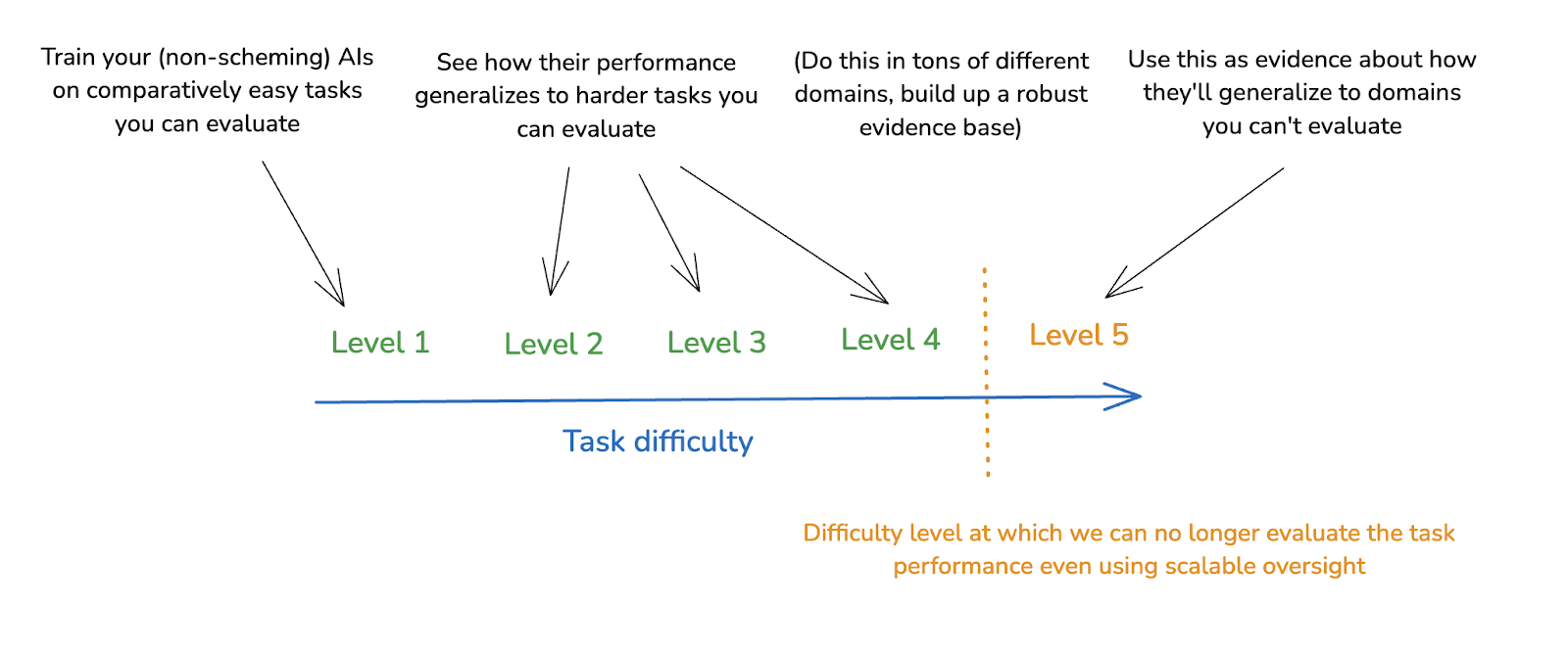We can also use scalable oversight techniques on process-focused evaluation – e.g., you can use AIs to amplify an attempt to audit an AI’s internals. But I’ll take output-focused evaluation as their paradigm application.