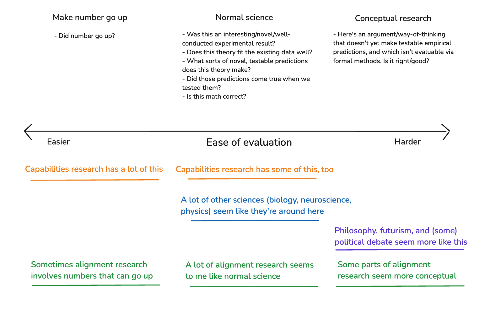 Lots of alignment research (what I call “empirical alignment research”) looks like normal science to me. And because I think humanity has a pretty good track record of evaluating normal science, I think we should be correspondingly optimistic about evaluating this type of alignment research, too. (Though: it’s still harder than evaluating number-go-up tasks.)