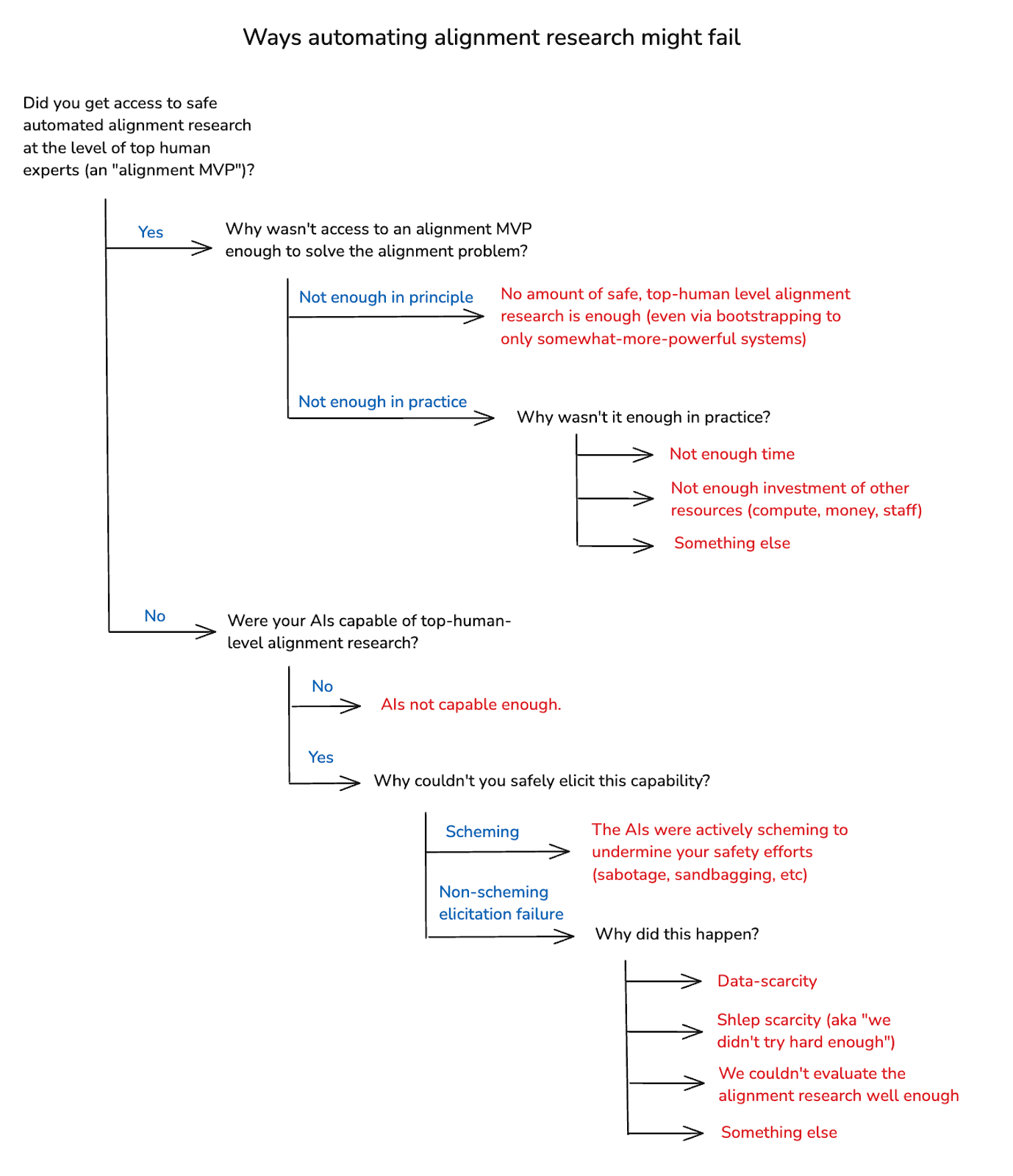 Beyond evaluation failures and scheming, I also discuss some more practical, resource-related failure modes for successfully automating alignment research, namely: data-scarcity, schlep, not having enough time to do enough work even with an alignment MVP, and not investing enough resources (compute, money, staff) into that work. I think these more practical failure modes are extremely serious, and I don’t have fancy responses. Basically: we need to actually put in the necessary work, and to make the necessary time. And in this respect, capability restraint remains extremely important.