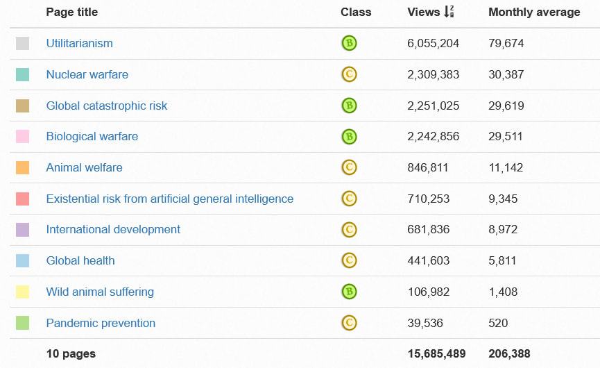 A great tool to get an overview of how many people read Wikipedia articles is the Wikipedia pageviews tool. What follows are a few screenshots displaying the pageviews for a selection of articles relevant to EA. The tool clearly shows that (i) some of these articles get a very large number of pageviews, and (ii) some pages get orders of magnitude more traffic than others.