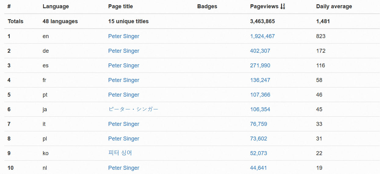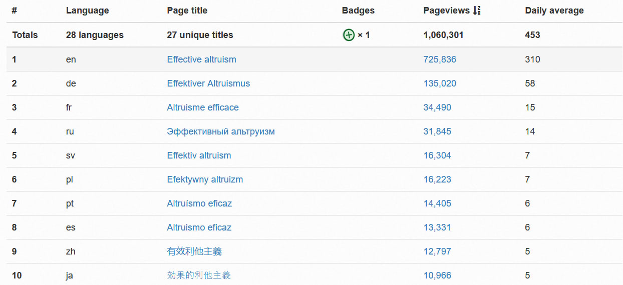For illustration, the following tables display the number of pageviews for the top 10 language versions of several EA-related Wikipedia articles.