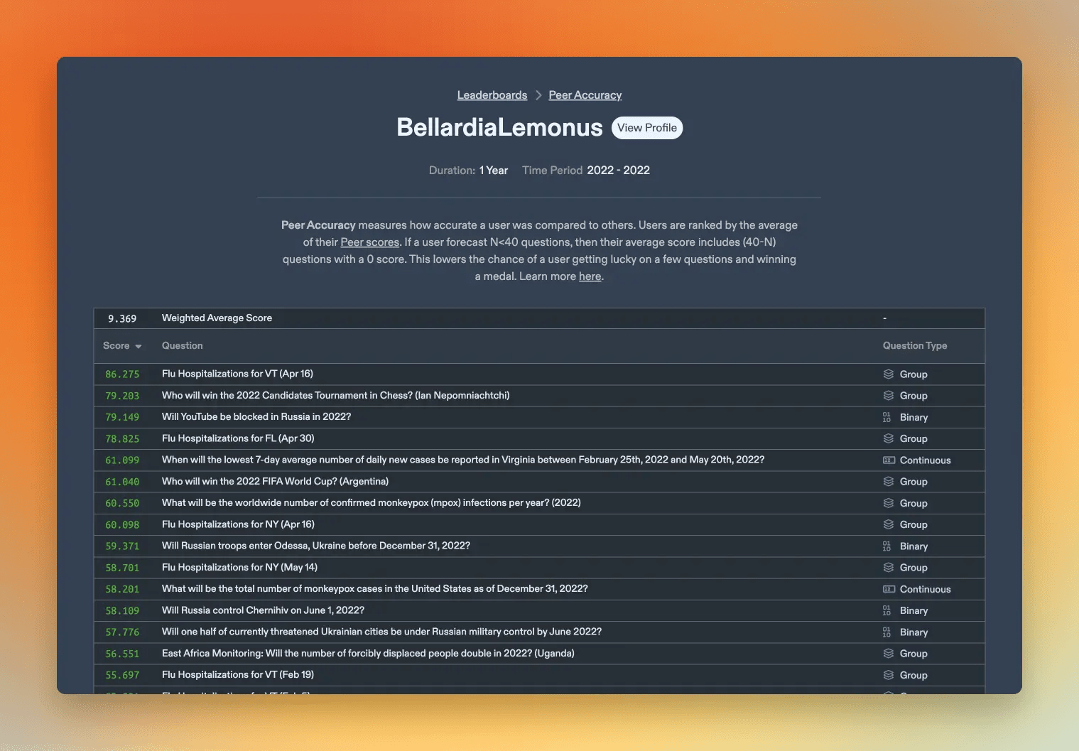 Some forecasters make deeply researched predictions on relatively few questions. The Peer Accuracy leaderboard recognizes their abilities and their contributions to Community Prediction accuracy across the platform.