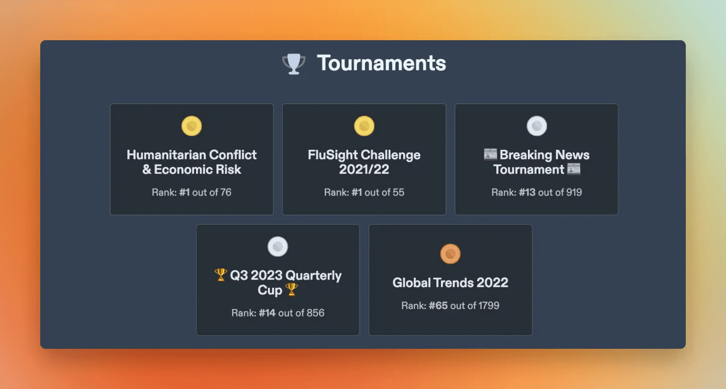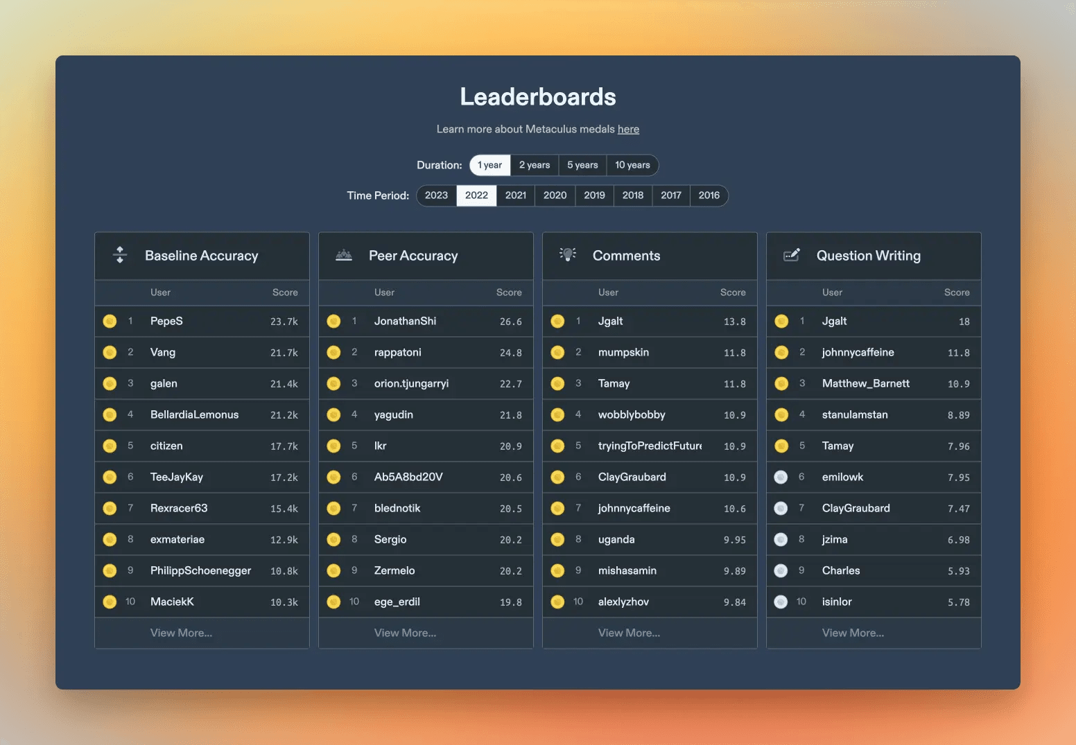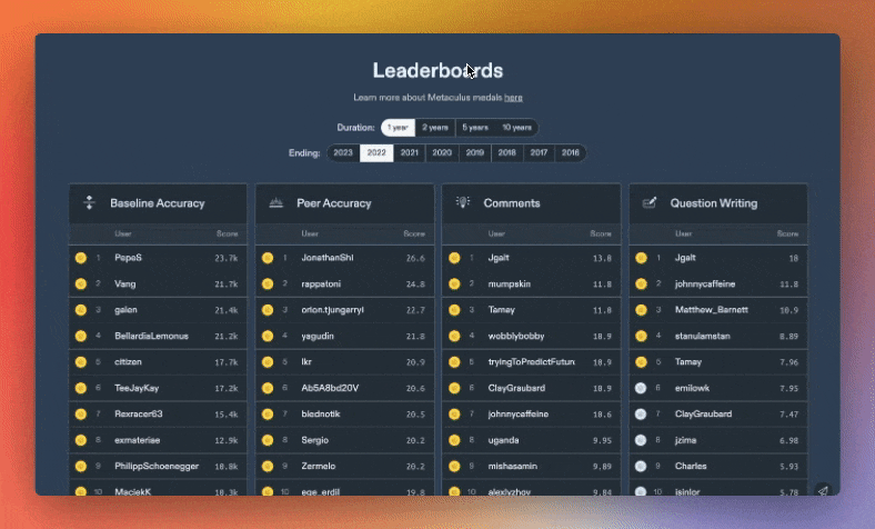 While building the new leaderboards, we knew we wanted to recognize the many Metaculus users who have shaped the platform over the years. We decided to retroactively award medals for all categories and time frames going all the way back to the site’s founding.