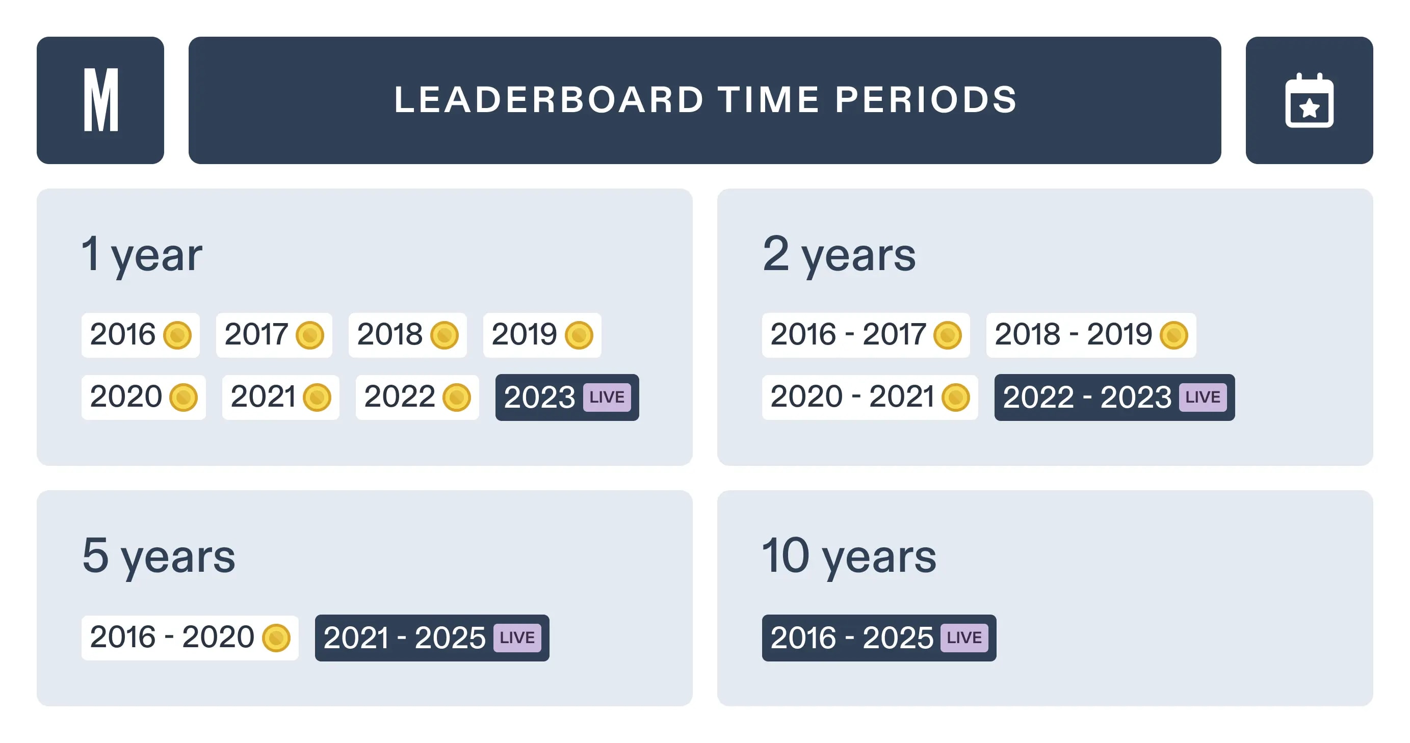 - Selecting Duration ‘5 years’ and Time Period ‘2021 - 2025’ ranks users according to questions that opened after January 1st, 2021, and will close by December 31st, 2025.