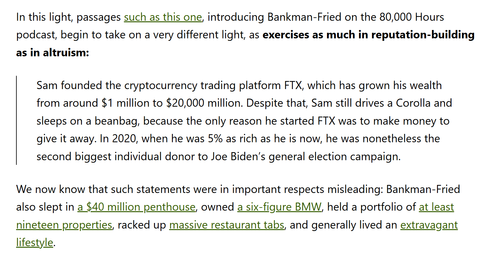 But note that two independent sources told me in private that the post-FTX-collapse comments from Habryka are inconsistent with what he used to say about SBF/FTX as late as April 2022, so I don't know how reliable they are, and afaik there are no public claims from anyone before November 2022 that SBF himself was lavish.