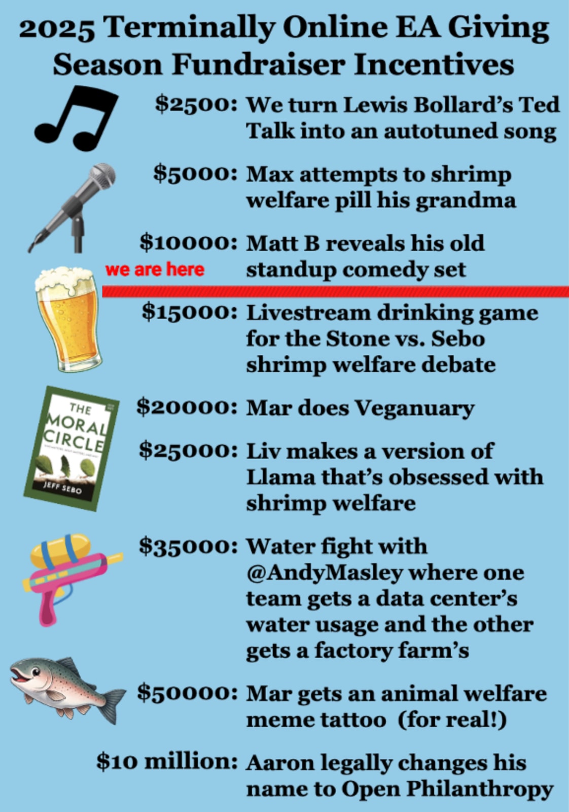 Each year the Terminally Online EA Fundraiser asks a bold question: What if your Twitter feed could reduce suffering? Whether you’re a forum poster, a memelord, a nematode welfare champion, or all of the above, we want you to celebrate impactful giving and have fun while doing so! It’s wonderful that donation celebration week on the EA forum overlaps with this annual silly fundraiser.