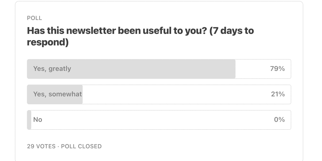 - I ran a very easy, press of a button survey in autumn, and most people said they found the newsletter useful (albeit a very small sample size of 29 and a bias towards most active users, but that just shows how people don’t have time for surveys, as I sent a Google Form that didn't get many answers at all)