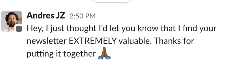 - E.g. I get people thanking me for the newsletter pretty much any time someone new introduces themselves to me, even if I don’t know them or their work yet. I guess it’s a good way to get your name out there.