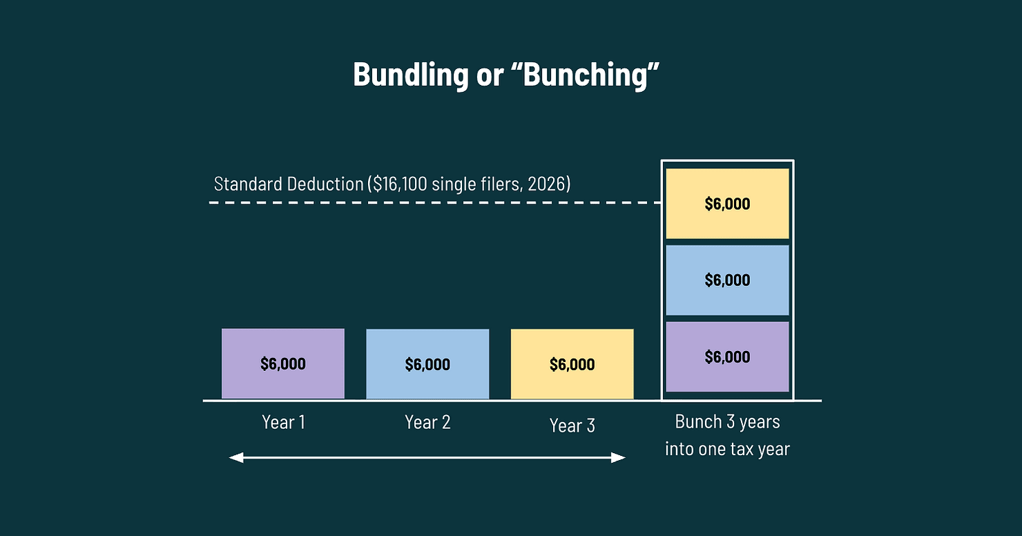 Bundling (donating multiple years of donations into one) is often framed as a clever hack. Perhaps instead of three consecutive years of donating $10,000, you decide to bunch $30,000 worth of donations into one year. This move surely warrants itemizing and will result in a tax deduction. And perhaps that deduction is large enough to push you down into a lower marginal tax bracket. Double-win!