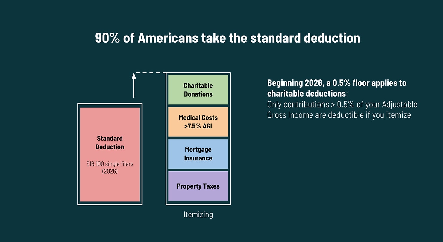 Furthermore, starting in 2026, charitable deductions for itemizers face a 0.5% Adjusted Gross Income (AGI) floor. Meaning: the first 0.5% of your income given to charity isn’t deductible at all. Another, albeit small, hurdle to itemizing.