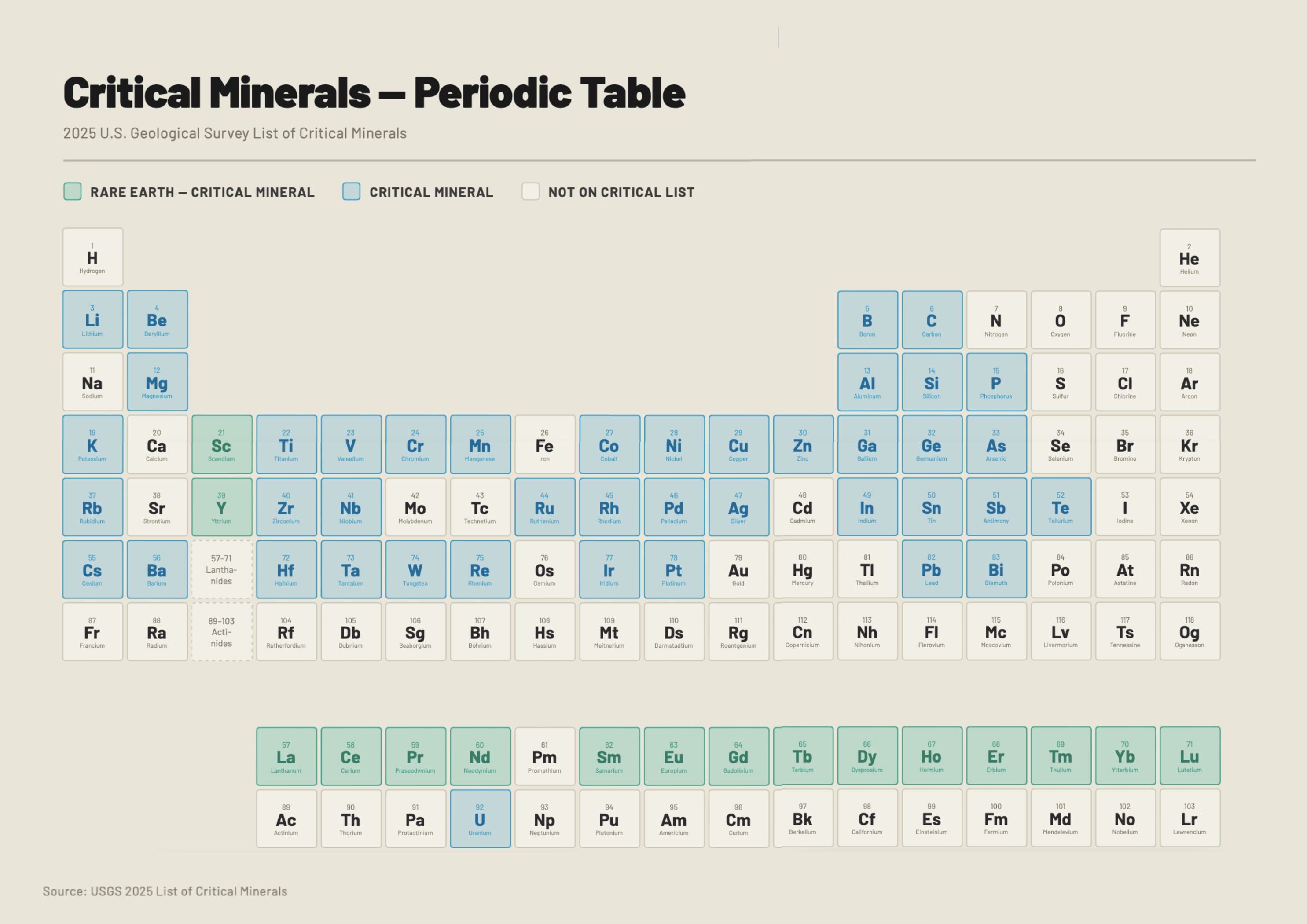 * The USGS critical minerals list is applied to the Periodic Table by using Claude.ai. Barite is presented on the table as barium, metallurgical coal as carbon, phosphate as phosphorus, and potash as potassium. Fluorspar (CaF2) is not reflected on this table.