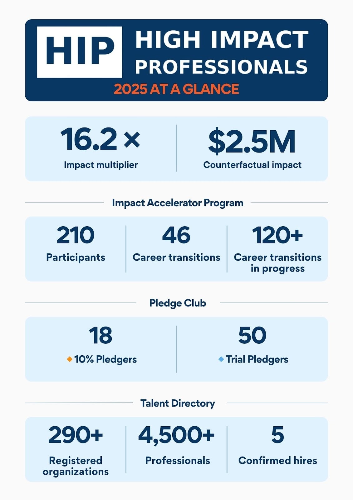 • 50+ high-impact career transitions, mainly through our Impact Accelerator Program