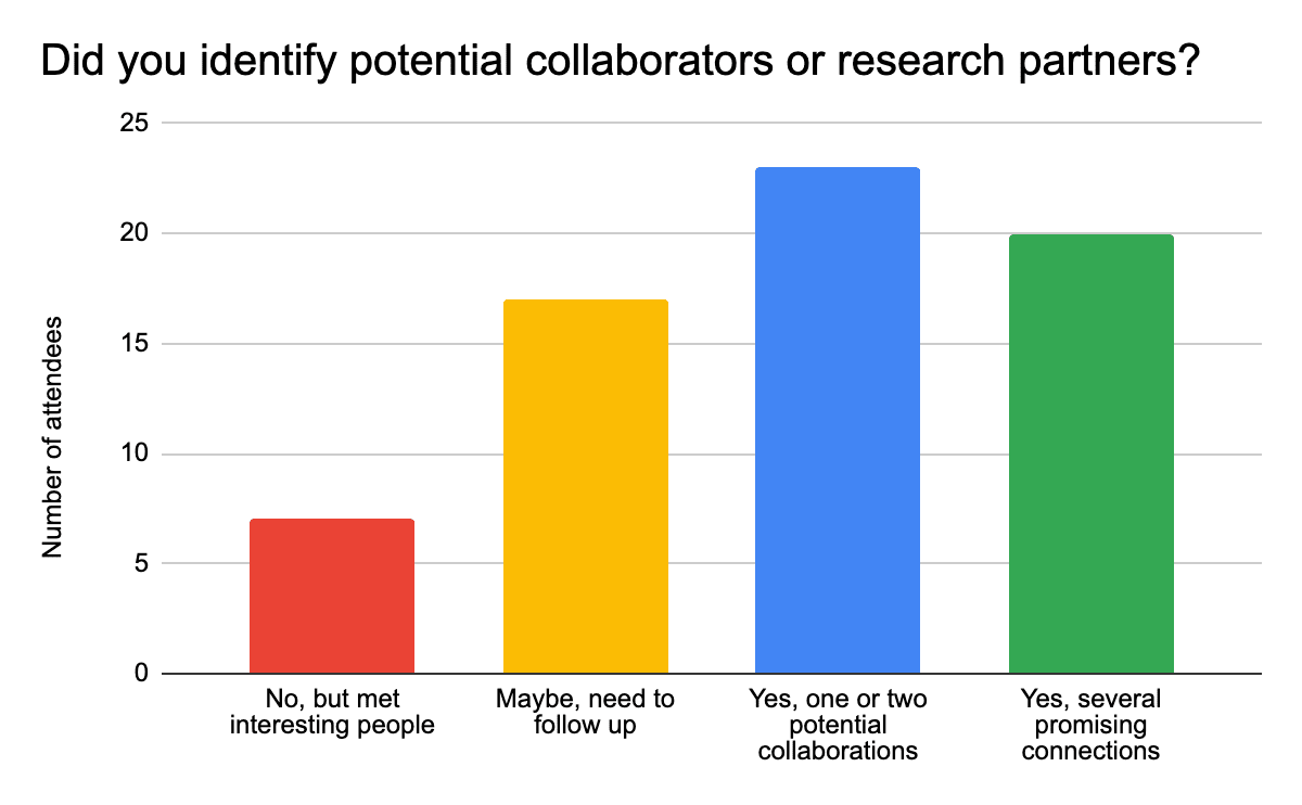 - Exceptional networking outcomes: most attendees made valuable connections, with many identifying "several promising connections" for future collaboration.