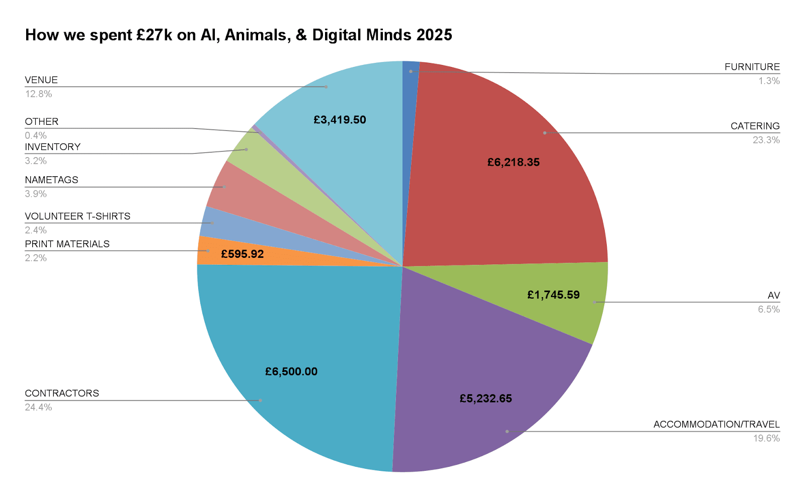 Our total spend of £27k ($36k) is significantly less than the £55k ($74k) we spent on the AI for Animals 2025 Bay Area conference in March. One reason for this difference is the lower number of attendees and participants in London – partly because we had much tighter restrictions on participant numbers due to venue size, and partly because the AI, animals and digital minds community is larger and more established in the Bay Area than in London. Another reason is that London is, in general, a cheaper city. We also made a deliberate effort to cut costs in London – some of this was sensible, like finding particularly affordable caterers and providing snacks ourselves. However, in hindsight, we should have spent more money to get a more experienced audio-visual (AV) team to livestream, record and edit talks.