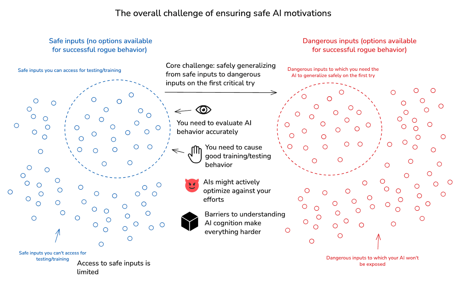 Reviewing the picture I just laid out, then: the central safety challenge of motivation control is to ensure desirable generalization from inputs that are safe to test to inputs that are dangerous to test – despite the inability to iterate on failure. And you need to ensure this despite difficulties evaluating and shaping AI behavior even on safe inputs; despite limitations on the range of such inputs you can access; despite the potential for adversarial dynamics in the AIs you’re working with; and despite difficulties understanding how AI systems work internally.