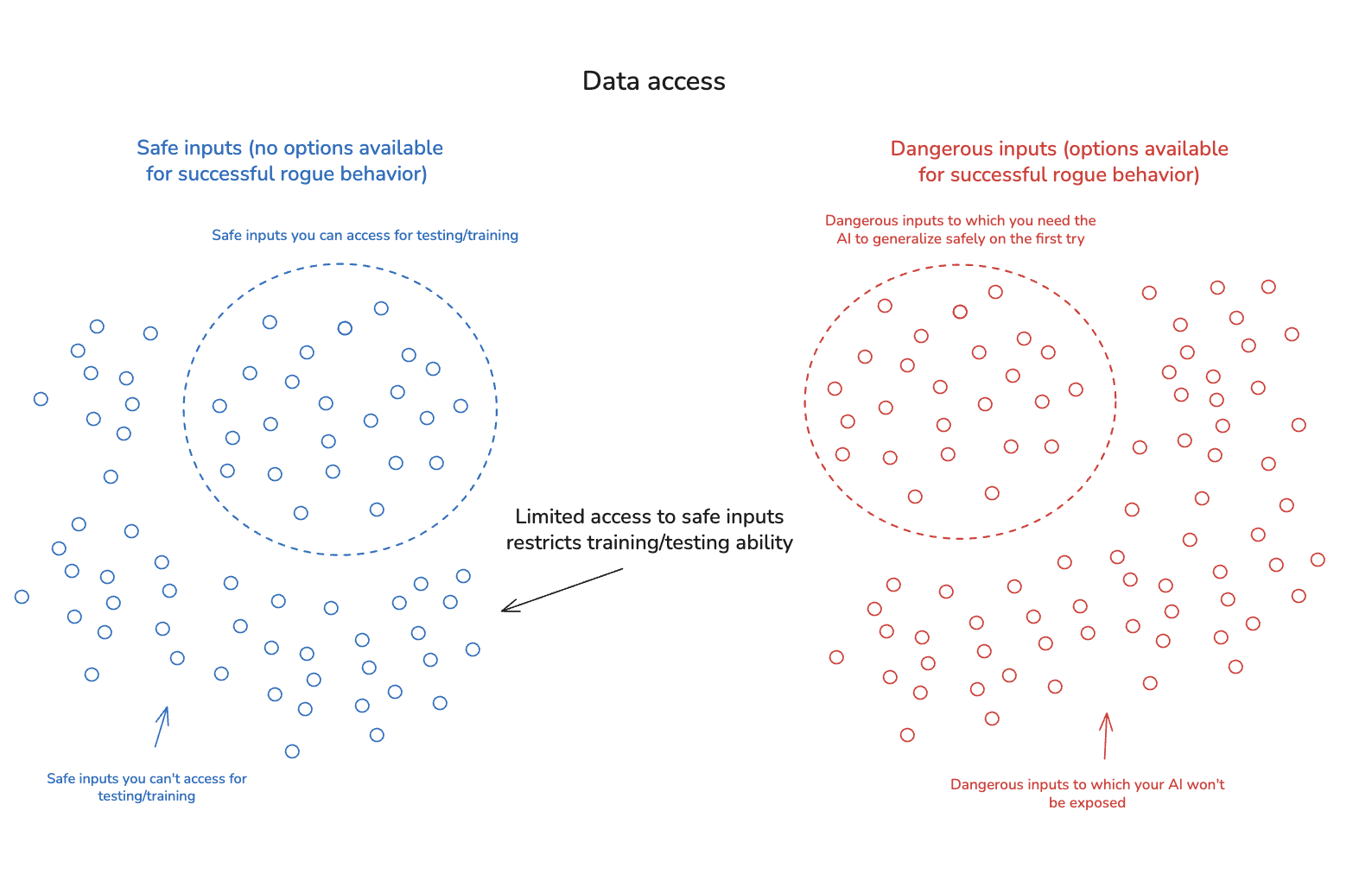 I’ll call this challenge “generalization without room for mistakes.” Here, “generalization” indicates the need to get safe behavior on catastrophically dangerous inputs via training/testing on some other set of safe inputs.[8] And “without room for mistakes” indicates inability to safely iterate on failure.