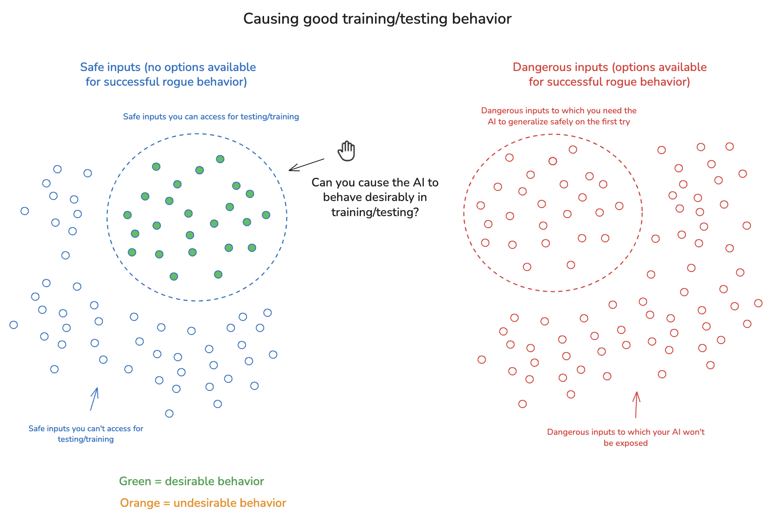 For visual simplicity, I’ve set up the diagram such that it looks like the set of dangerous inputs is importantly distinct/separable from the safe inputs. In reality, though, and depending on how we understand the “space” they are occupying, they might be much more intermixed. Also, to be clear, the relative size of the different sets of inputs on the diagram isn’t meaningful. And note, too, that the leap from safe to dangerous inputs doesn’t need to coincide with beginning to deploy a model in some real-world context. To the contrary: dangerous inputs can occur prior to deployment (e.g., if a training environment makes options for self-exfiltration available), and deployment inputs can be fully safe (e.g., if there is enough powerful and plentiful oversight to block options for rogue behavior). In this sense, when I talk about “training/testing” below, safe forms of deployment would qualify, as they are a type of safe “test” of how an AI behaves (and it will often be possible to use them for training as well).