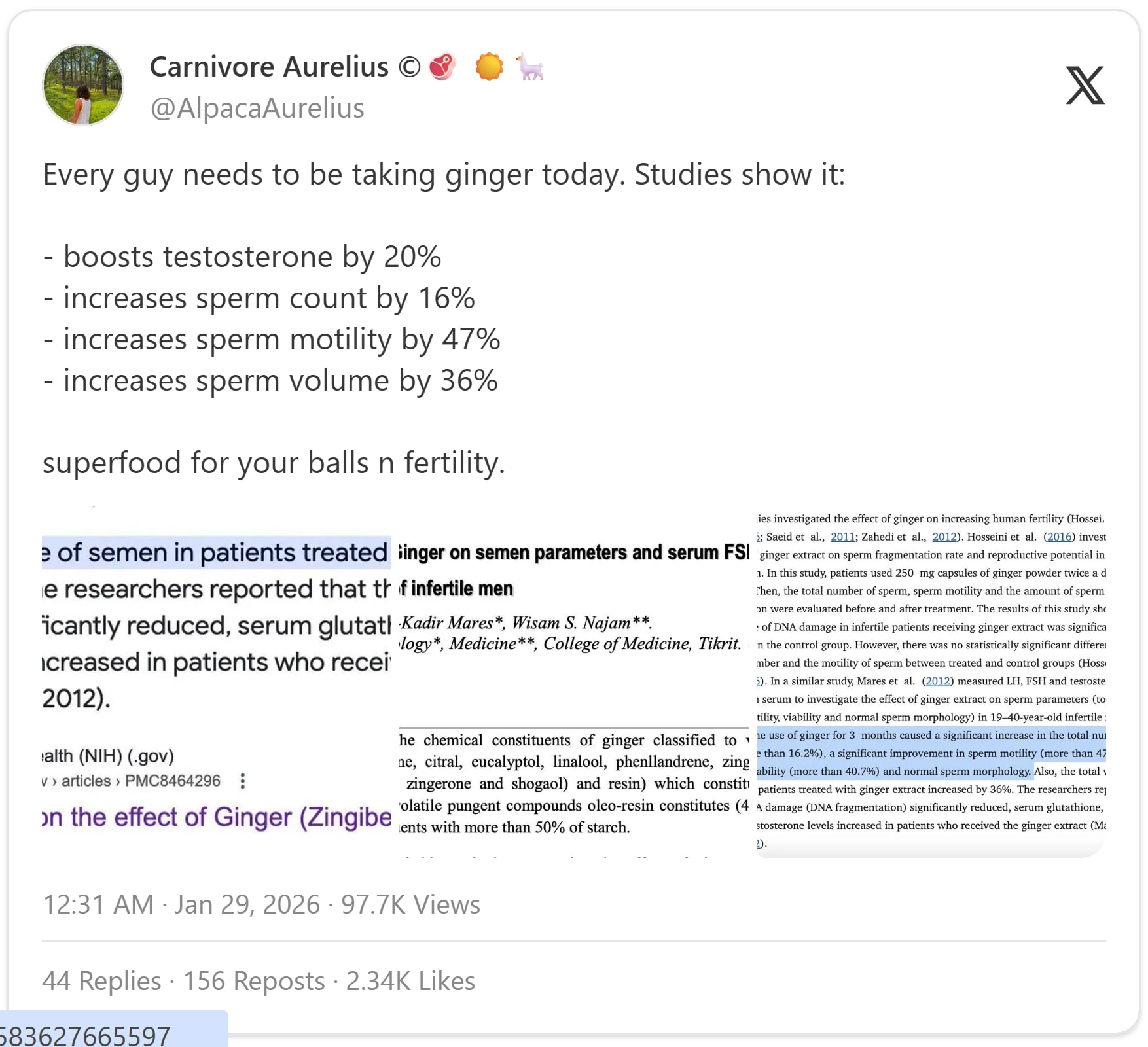 To which I replied, “[Friend], I’m afraid we’re going to need to have a conversation about Plausible Effect Sizes…[in which I] adduce 15 reasons why there is no plausible way that ginger increases testosterone by 20%. I would have accepted 1% or 2%”. (This is exactly how I’m going to talk to MAHA, by the way.) I then actually read the posted pictures rather than just the highlighted parts, and noticed, from a 2021 systematic review: “there was no statistically significant difference in the total number and the motility of sperm between treated and control groups (Hosseini et al, 2016).” (Testosterone is just one of many outcomes they look at, which, by the way, presents a garden of forking paths problem.) So there’s your first gotcha: the tweeter is cherry-picking results. Seeing this didn’t take any special expertise. I just had to read the text.