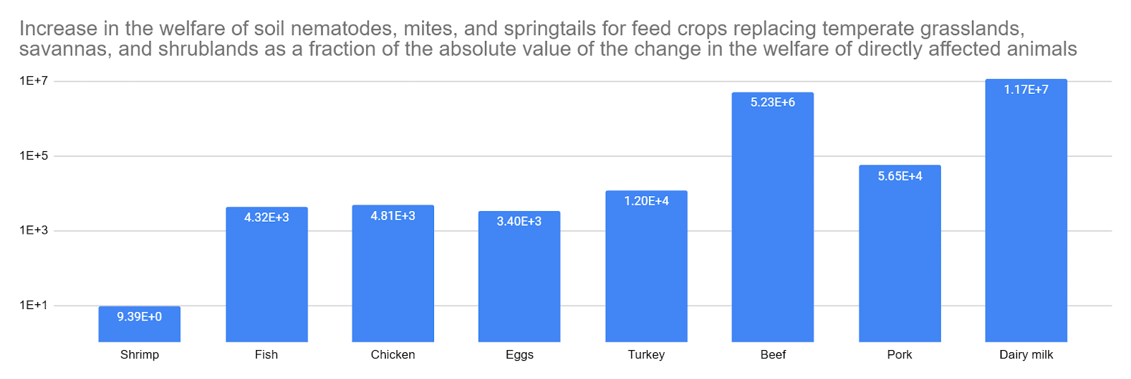 I estimate animal farming increases the welfare of soil nematodes, mites, and springtails hugely more than it changes that of directly affected animals. For example, I conclude 0.1 kg of chicken meat decreases the welfare of directly affected animals by 0.00593 QALYs, but increases that of soil nematodes, mites, and springtails by 28.5 QALYs for feed crops replacing temperate grasslands, savannas, and shrublands, which is 4.81 k times as many QALYs. For that land use change, among the 8 animal-based foods below, the increase in the welfare of soil nematodes, mites, and springtails ranges from 9.39 (shrimp) to 11.7 M (dairy milk) times the absolute value of the change in the welfare of directly affected animals.