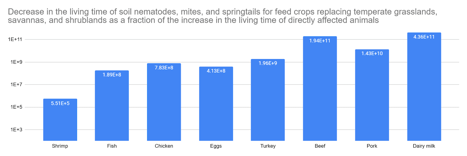 I estimate animal farming decreases the living time of soil nematodes, mites, and springtails animals hugely more than it increases that of directly affected animals. For example, I conclude 0.1 kg of chicken meat causes 2.87 animal-days more in directly affected animals, but 6.16 M animal-years less in soil nematodes, mites, and springtails for feed crops replacing temperate grasslands, savannas, and shrublands, which is 783 M times as many animal-years. For that land use change, among the 8 animal-based foods below, the decrease in the living time of soil nematodes, mites, and springtails ranges from 551 k (shrimp) to 436 billion (dairy milk) times the living time of directly affected animals.