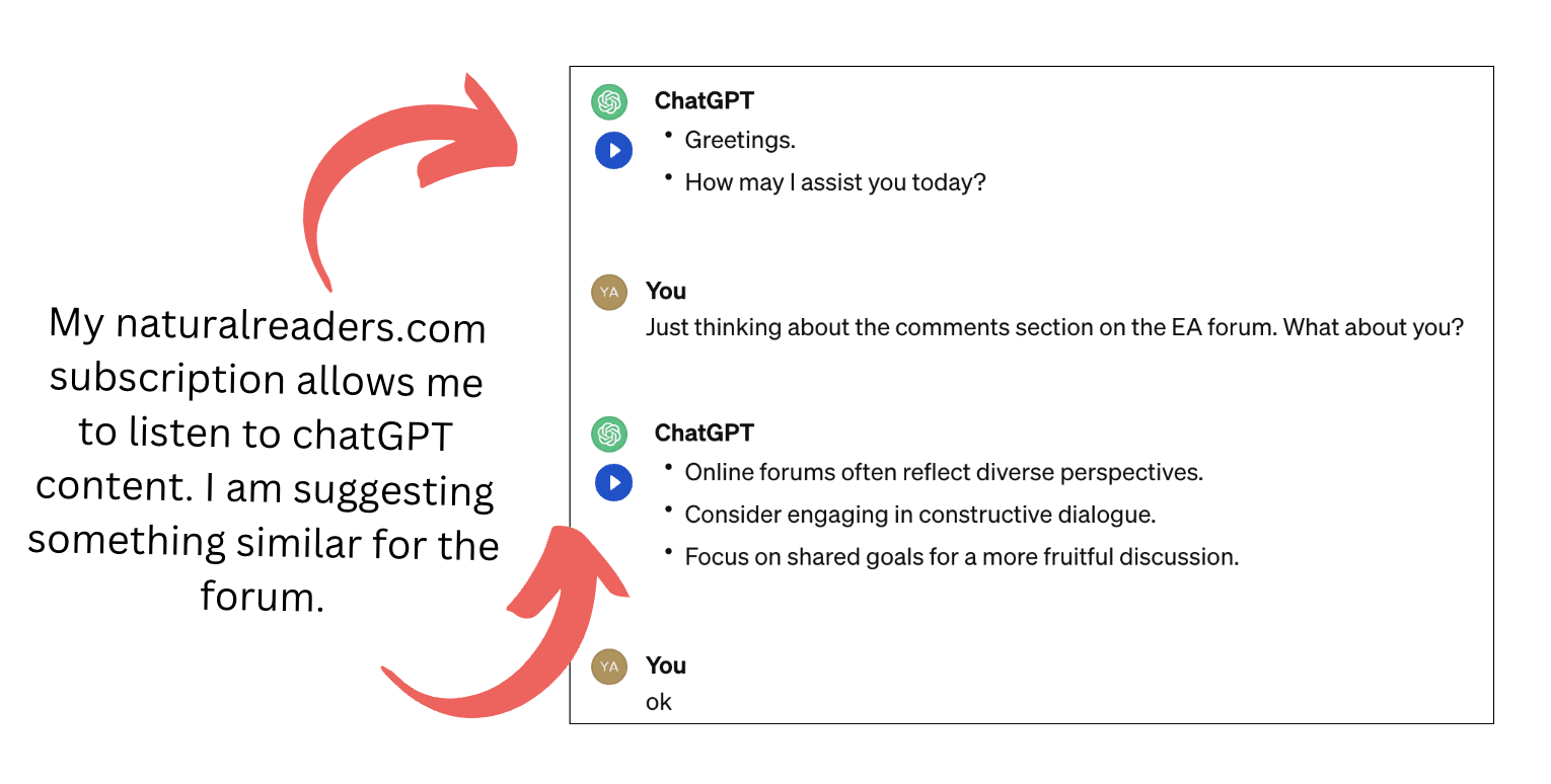 I subscribe to naturalreaders.com (best $90 I ever spent FYI), and it plugs into the desktop version of chatGPT like the below. I am suggesting something similar for the forum.