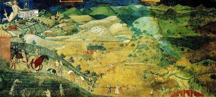 One of the long walls shows the Effects of good government. The harvest is ready in the fields and vineyards beyond the city walls, a farmer drives his pig to town, the city is clean and elegant, and citizens are dancing in the streets to celebrate a wedding.