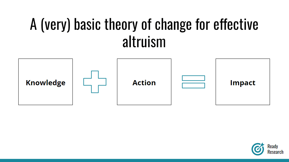 Examples of things we can do at the knowledge stage include understanding which charities are most effective, creating problem profiles, and predicting what existential risks are most consequential or likely. At the action stage, we could donate to those charities, make career changes based on what we think is most impactful, or actually work to prevent existential risks.