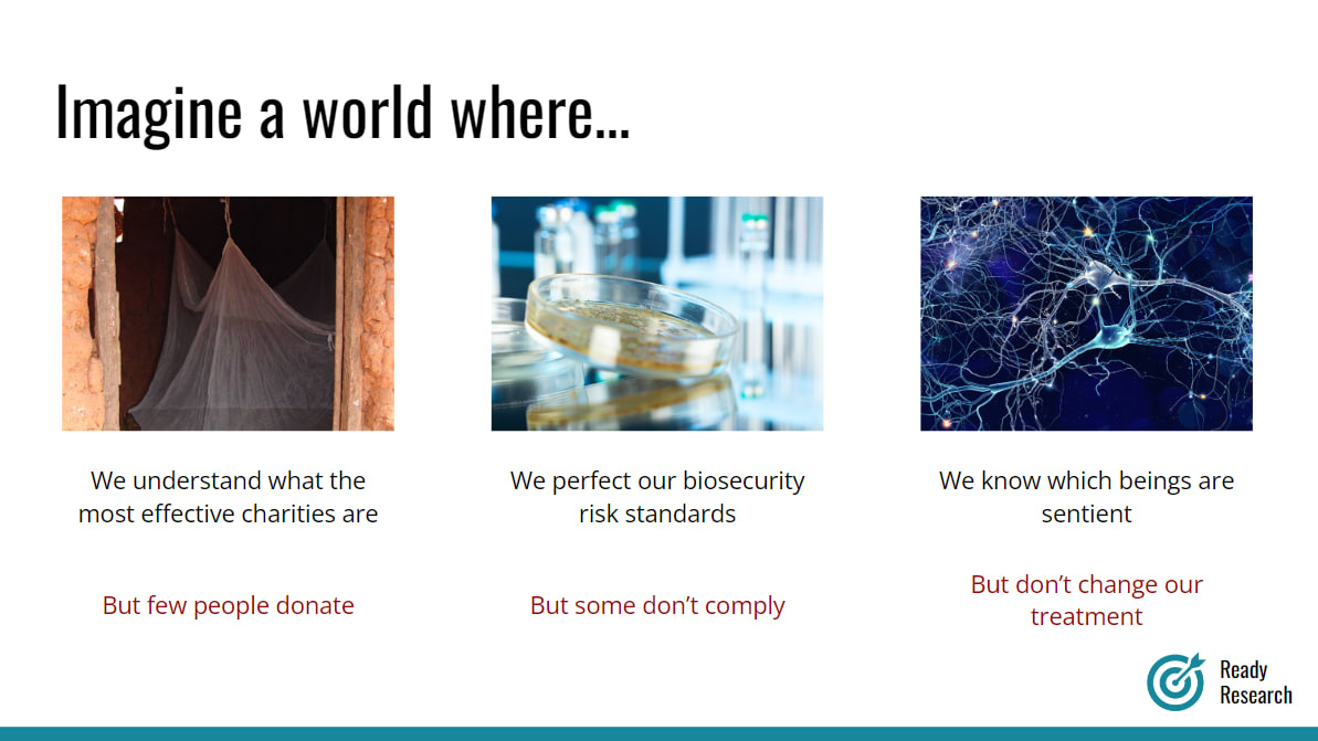 How does behavioural science come into this? It focuses on the action stage and it asks, ‘How?’. How do we get people to donate to effective charities? How do we encourage others to make career changes, or work to prevent existential risks? Behavioural science can inform how we act, or how we get others to act, in order to enhance our impact.