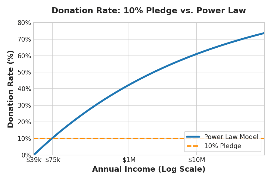 Is there something better that captures the extreme variance in salary these days, eg with junior AI engineers earning >$1M/year? I propose a power law where someone with income Y should donate everything except a consumption budget . Then the donation rate is calculated as .