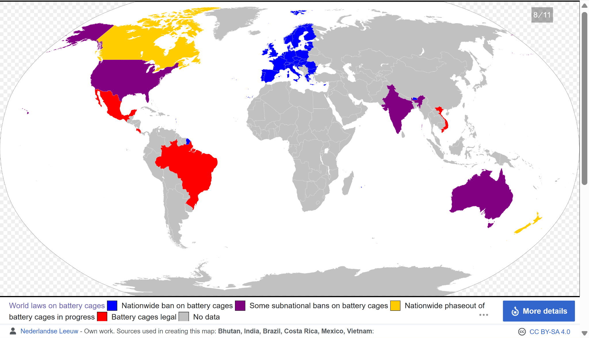 The countries with active national bans on keeping hens in conventional cages are in blue below. They mostly are all the countries in the European Union (EU), where conventional cages have been banned since 2012, and a few more in Europe, including Norway, Switzerland, the United Kingdom (UK). French Guiana, a department of France, is the blue area in South America, and Bhutan is the one in South Asia. Canada and New Zealand, in yellow below, have passed bans. Australia, India, and the United States, in purple below, have active subnational bans. Yet, conventional cages remain legal in the vast majority of countries outside Europe. In particular, in ones in Africa and Asia, which are projected to account for 80.2 % (= (5.28 + 2.47)/9.66) of the global population in 2050. However, I am only aware of impact-focussed organisations advocating for companies to source eggs from cage-free instead of caged hens, not from ones in furnished instead of conventional cages.