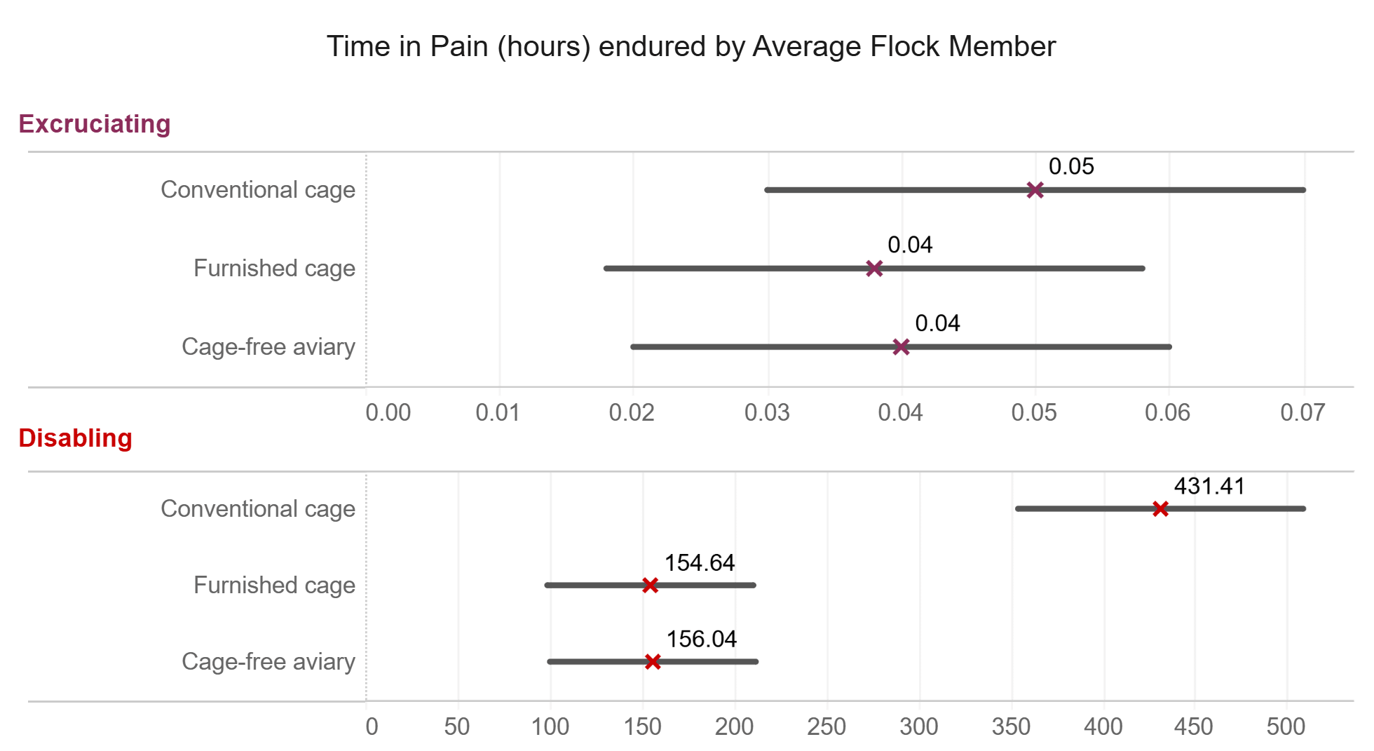 I value increasing happiness, and decreasing suffering proportionally to their probability, duration, and intensity. In other words, I only care about increasing expected total hedonistic welfare. In this case, my best guess is that moving hens from conventional to furnished cages is 70.6 % as beneficial as moving hens from conventional cages to cage-free aviaries. However, I think the fraction would be even higher if decreasing more intense suffering had a special value (higher than proportional to its intensity). The time hens in conventional and furnished cages spend in disabling/excruciating pain is very similar according to WFI’s underestimates, as illustrated above and below. My best guesses are still similar, but less similar because Cynthia noted accounting for the neglected welfare issues would increase the time in pain in the baseline conditions more than in the improved conditions. I got 213 and 195 h of disabling pain for hens in conventional and furnished cages.