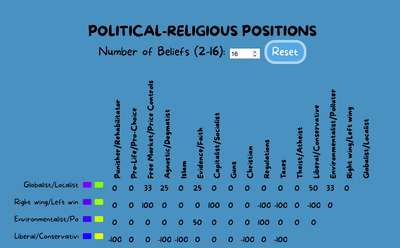 You can explore the correlations between beliefs, revealing how many familiar correlations arise even without a specific valence being ascribed.