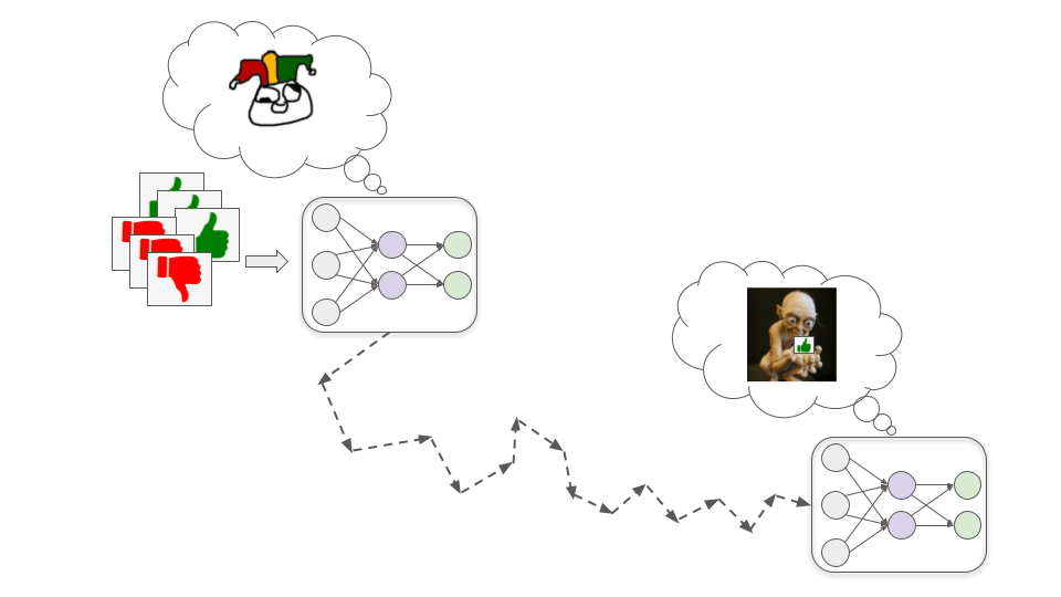- 8歳の子どもが候補者を評価する唯一の方法は、外から見てわかる行動を観察することであり、これは深層学習モデルを訓練するために現在使われている主な方法でもあります(というのも、モデルの内部構造はほとんど解明できないので)。