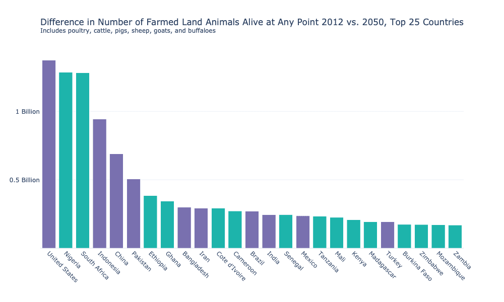 Africa is a diverse continent and stating numbers for the whole of it overlooks many developments at the individual country level. While a sharp increase in farmed animal numbers is anticipated for most African countries, Nigeria and South Africa stand out, ranking second and third globally in terms of absolute livestock increase. Nigeria is expected to witness a four- to five-fold increase in farmed animals, from 358 million to 1.64 billion. South Africa will see a more than six-fold increase, from 250 million to 1.53 billion, as evident in the graph below.