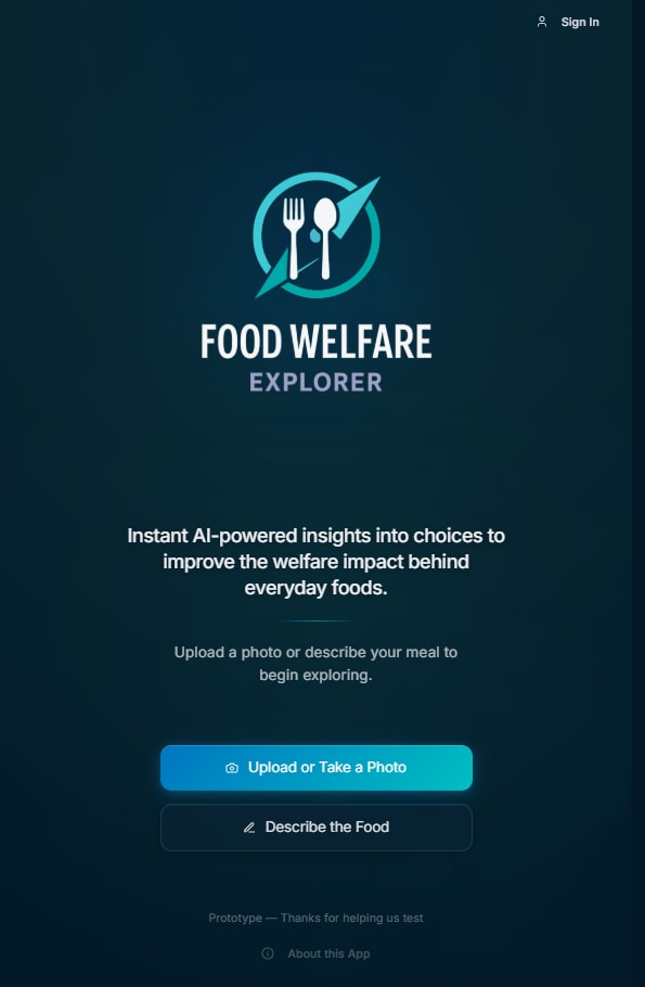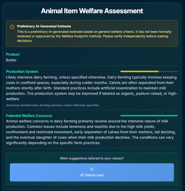 Summary: We have developed a prototype app called the Food Welfare Explorer. This tool uses AI to provide approximate, tentative animal welfare analyses based on food pictures or descriptions. Its primary purpose is to test how to best communicate welfare information to consumers immediately, acting as a bridge while long-term, quantitative data using the Welfare Footprint Framework (WFF) is still being developed. We are currently seeking specific feedback from the Effective Altruism (EA) community on the app's design, content, and communication strategy to ensure that when rigorous scientific data is ready, the interface to deliver it is ready too.