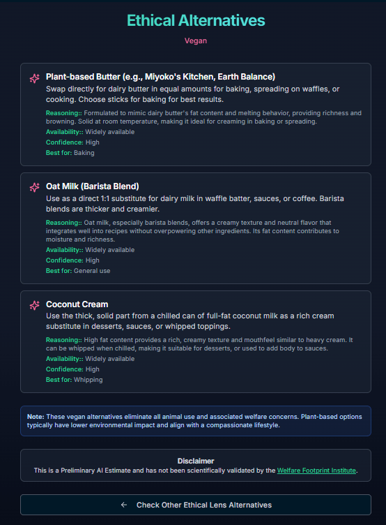 - Analysis: The system identifies animal-derived ingredients and generates a brief welfare analysis.
