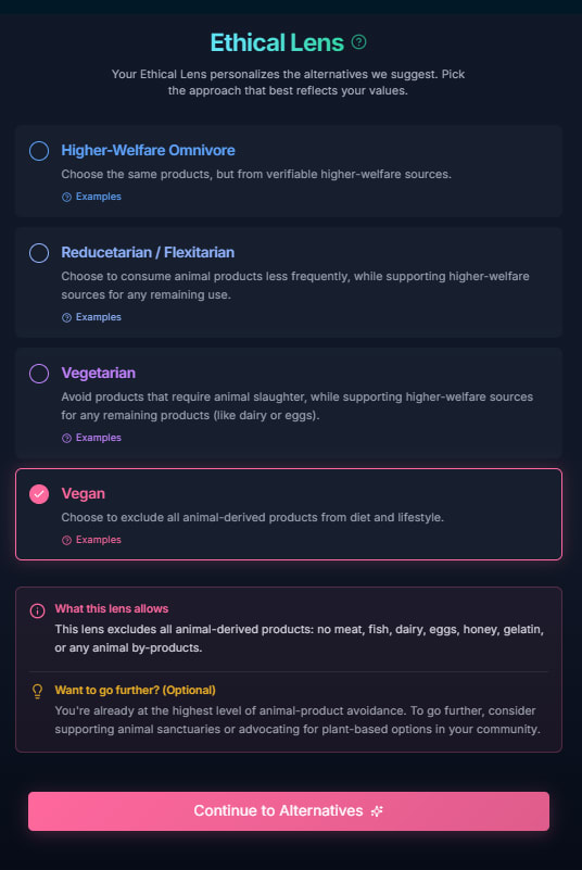 This lens seeks to avoid the use of animals in consumption altogether, extending beyond food to areas such as clothing and other everyday products. It excludes meat, dairy, eggs, honey, leather, wool, silk, and related materials.