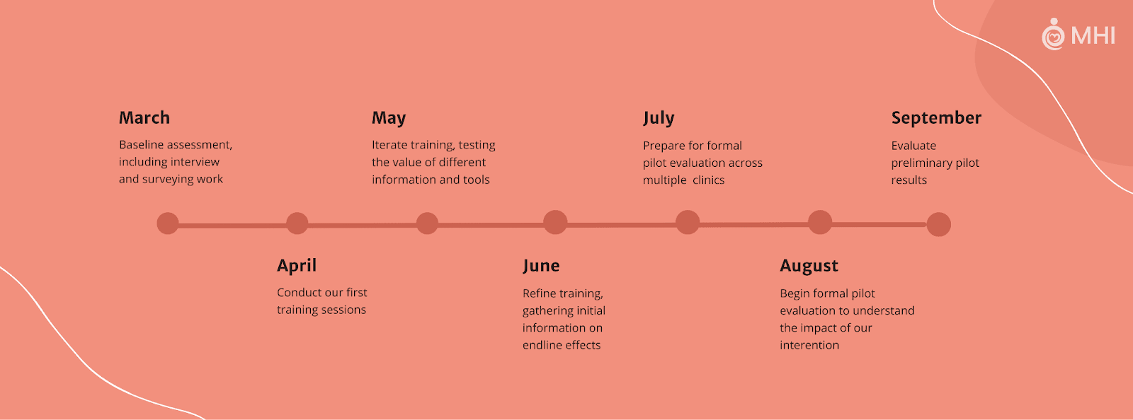 In the next month we will run our first training sessions, giving us an initial indication of our potential impact. From there, we will then iterate our approach, with plans to run a formal pilot evaluation in August. By October, we intend to have these results analysed, demonstrating either the cost-effectiveness of our work or the need for MHI to pivot in its operations.