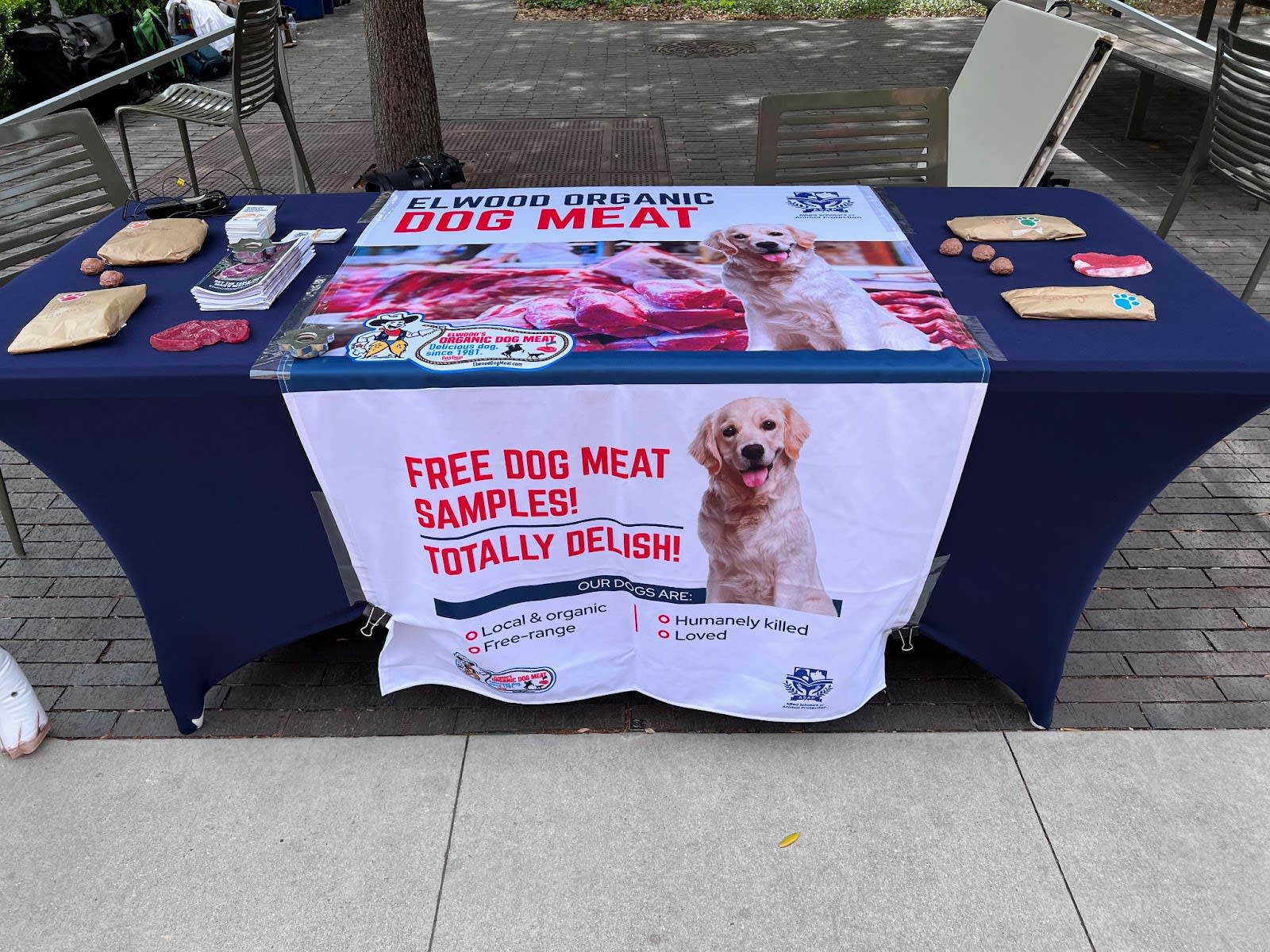 Needless to say, we don’t actually give people dog meat. We advertise the meat to draw passerby into a conversation, and eventually tell them that it’s not real. If you want to try this yourself, we recommend using Beyond or Impossible meat, though you can also just not give them anything.