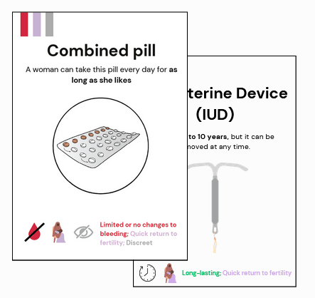 The postnatal care (PNC) arm integrates 10-15 minute family planning counselling into existing individual one-on-one appointments that take place 48 hours, 2 weeks, and 6 weeks post-birth. We developed a conversation guide and method cards to facilitate sessions and emphasise the delivery of client-centred care.
