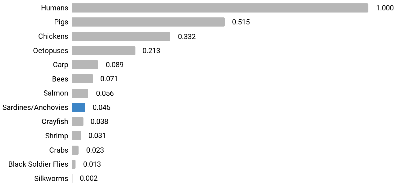 Rethink Priorities assesses the moral weights of different sentient species by estimating how wide their ranges of possible positive and negative experiences are, using factors like brain structure, learning ability, behavioural flexibility, emotional capacity, and social behaviour.[24] Although sardines and anchovies have not been directly assessed, it is possible to make an informed estimate on the basis of their simple, instinct-driven behaviours: