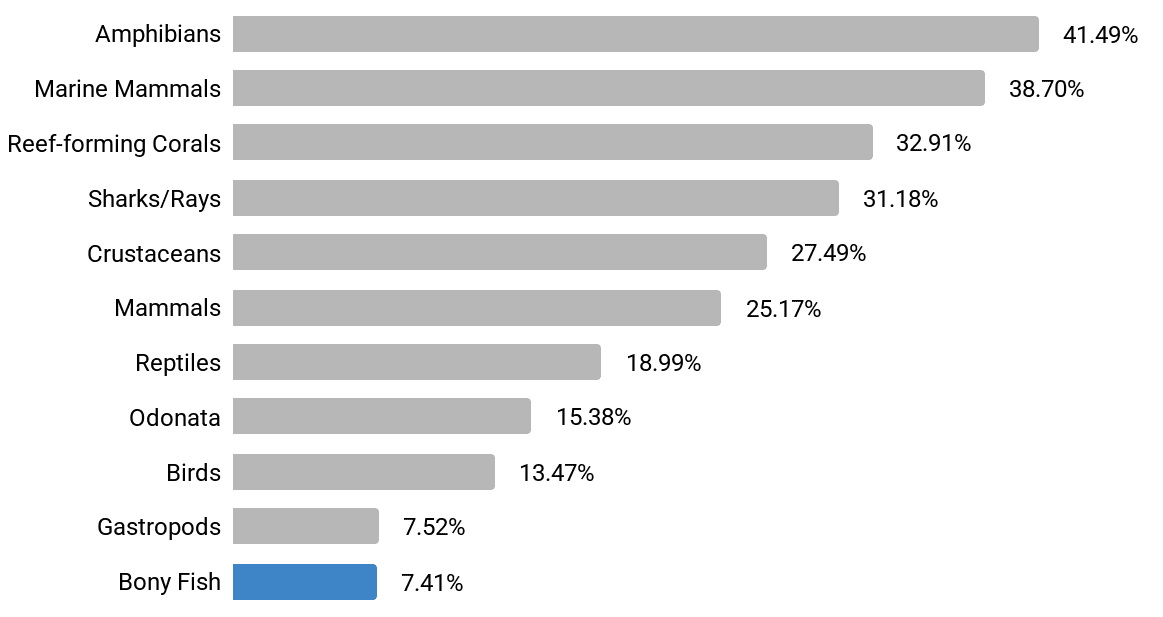 Sardines and anchovies are broadcast spawners with short lifespans and high reproductive rates, which makes them highly resilient to fishing pressure and has ensured their consistent abundance worldwide.[18] On top of that, their populations are well-managed in European waters through annually adjusted and effectively enforced catch quotas.[19] While sustained increases in demand could potentially create political pressure to raise them, especially when short-term economic goals take priority, these quotas are aligned with the long-term interests of the fishing industry and therefore generally supported by it. Most sardines and anchovies are currently used for aquaculture feed and pet food, but the fact that many feed producers are already shifting to plant-based alternatives shows that such a transition is feasible.[20] Since total catch volumes are capped, increased human consumption is therefore unlikely to raise fishing pressure but rather redirect use from feed to food. From a food justice perspective, it is important to note that rising European demand would overwhelmingly be met by local, cost-efficient EU fisheries, since fisheries in the Global South primarily produce fishmeal for export rather than food for human consumption. Overall, the greatest threat to sardine and anchovy populations is not fishing, but climate change, which disrupts their food supply and spawning patterns through changes in ocean temperatures and currents. Even so, only a small fraction of bony fish species are considered threatened with extinction, reflecting the resilience of species like sardines and anchovies. See below for the estimated percentage of threatened species by different species groups.[21]