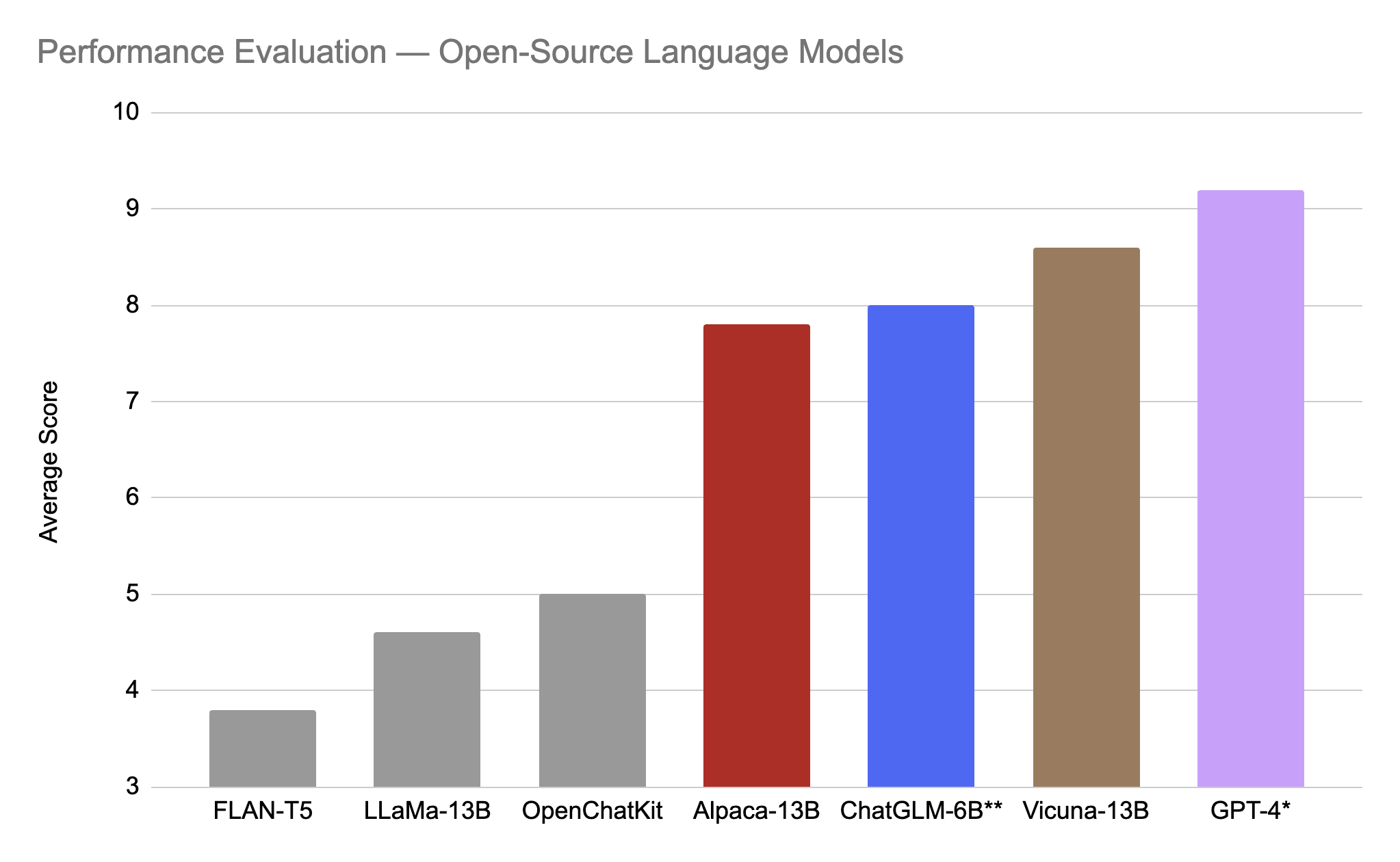 We asked GPT-4 to rate the outputs from various open-source language models on a scale of 1 to 10 for five different prompts. The outputs and prompts can be found in this Google Doc.