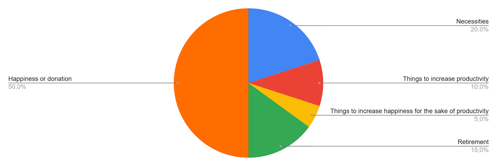 - Even if you only care about donating as much as possible, you should still spend some money to help increase your own happiness. This amount should be a smaller fraction of your total post tax income, the more you earn. But the total amount should be higher the more you earn. (This is because money has a diminishing return on happiness (and thus productivity), but the more you earn, the bigger return you’ll get from investing in your productivity/happiness.)