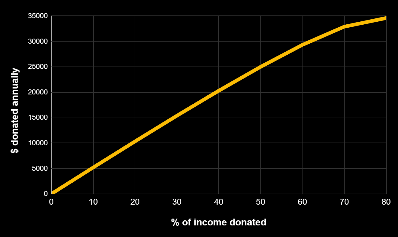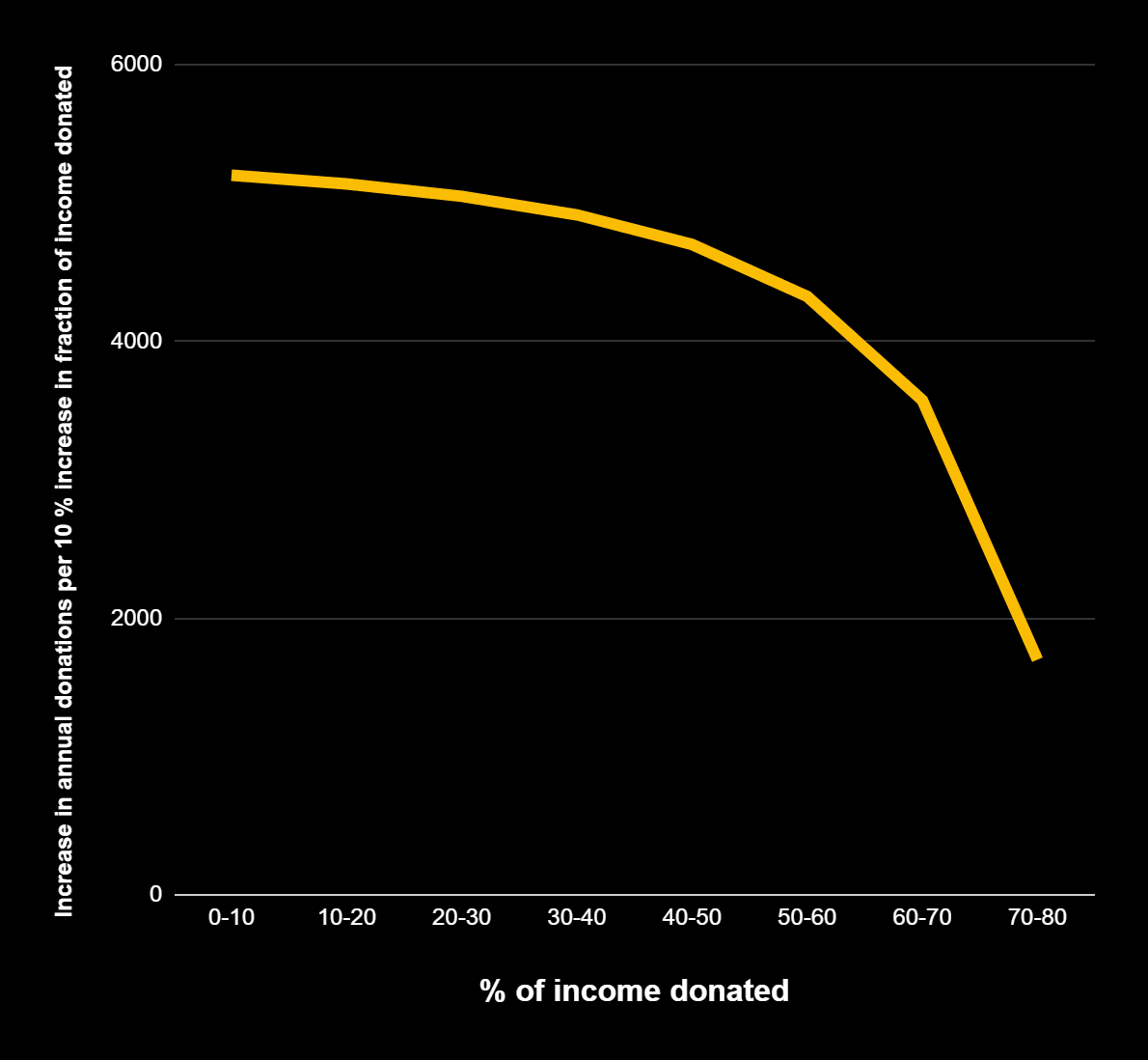Fig. 6 Graf showing total increase in annual money donated, per 10% incremental increase in the fraction of posttax money donated.