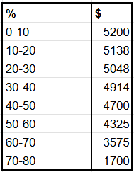 - 0-60%: There’s an almost linear increase in money donated with the increase in the fraction of money donated (e.g. from 0% to 10% the increase is $5.200 and from 50% to 60% the increase is ~$4.300).