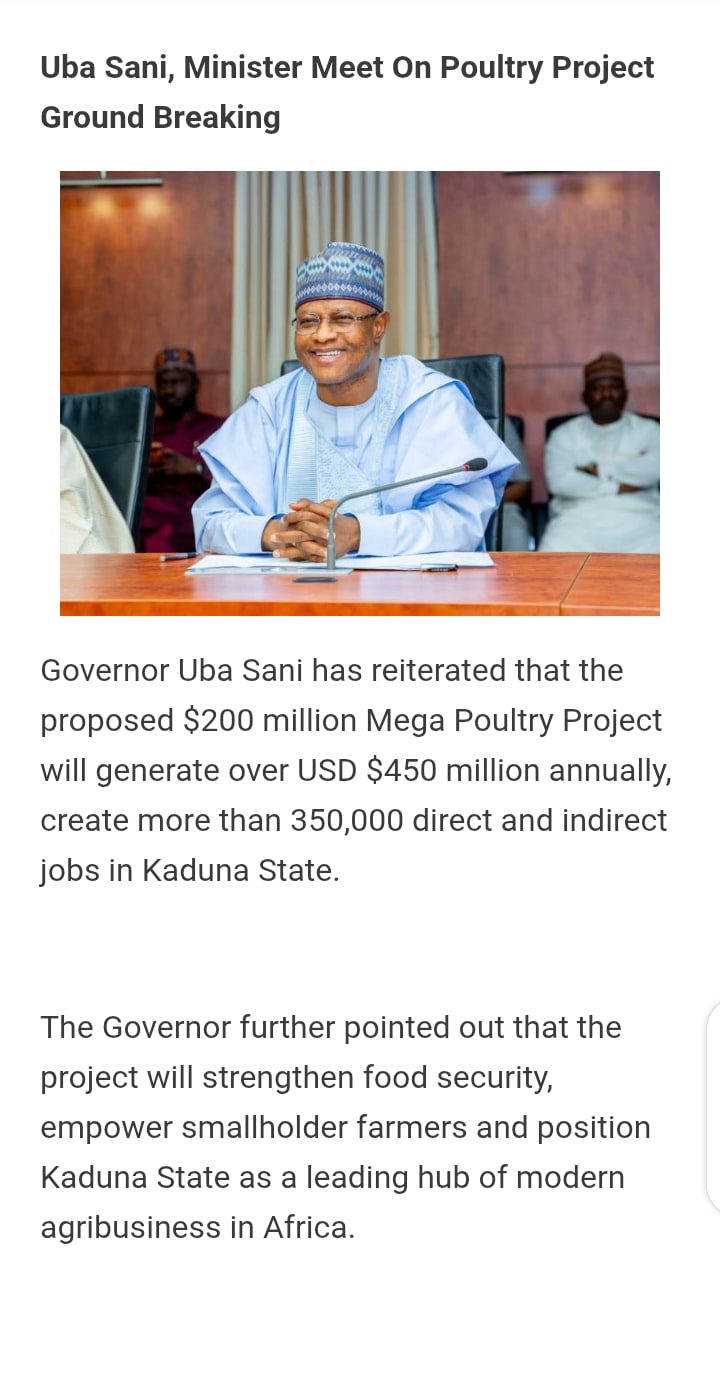 Sometime in December 2025, the governor of Kaduna State in Nigeria, Uba Sani, visited China. In the course of the visit, he was invited to CP Foods Layers and Eggs (Beijing) Limited, which produces more than 3 million eggs daily. The visit led to the Kaduna poultry initiative being conceived with Chinese partners.