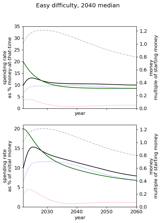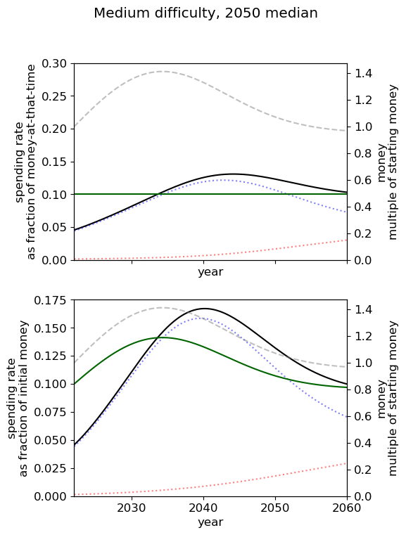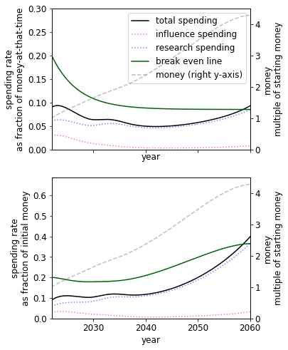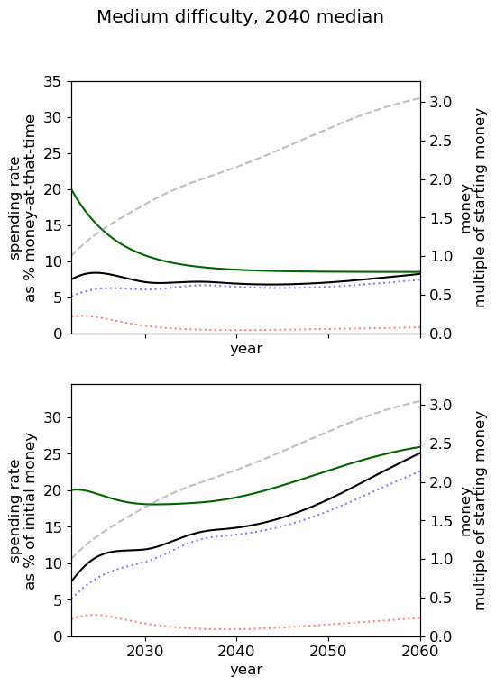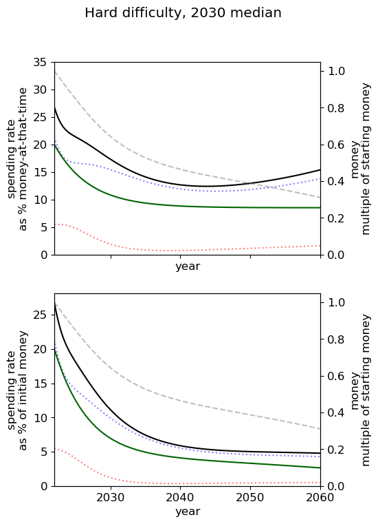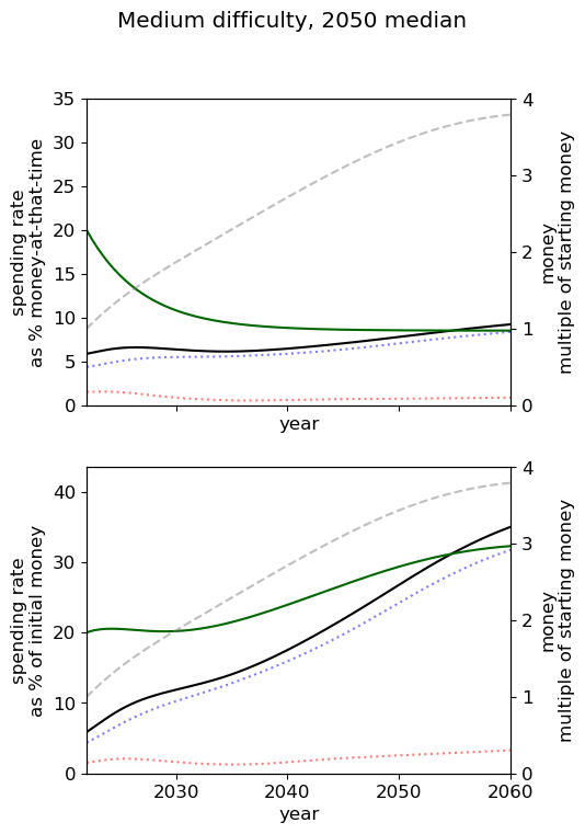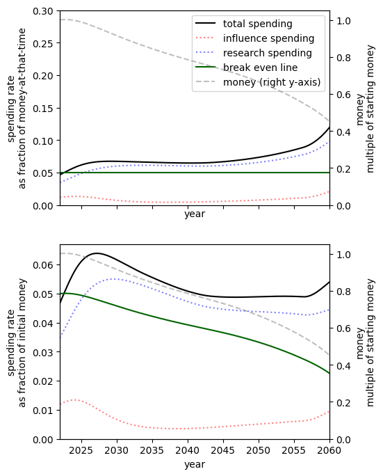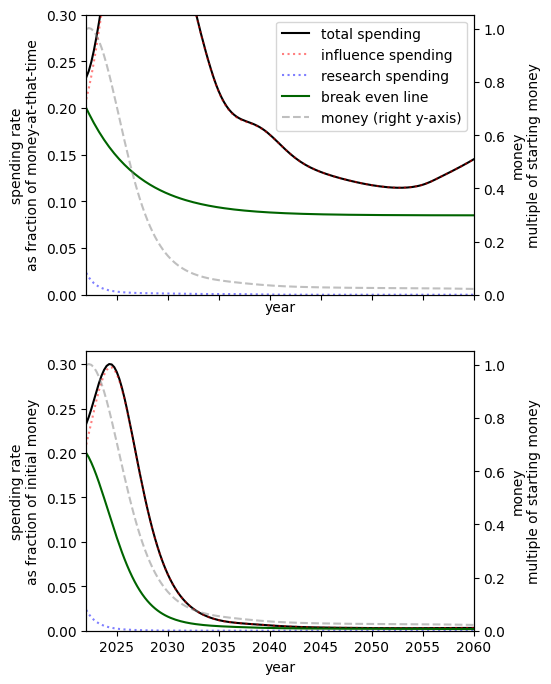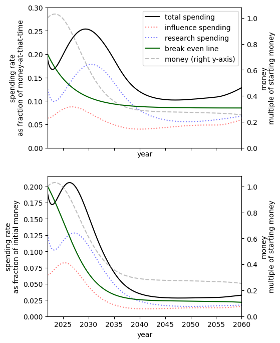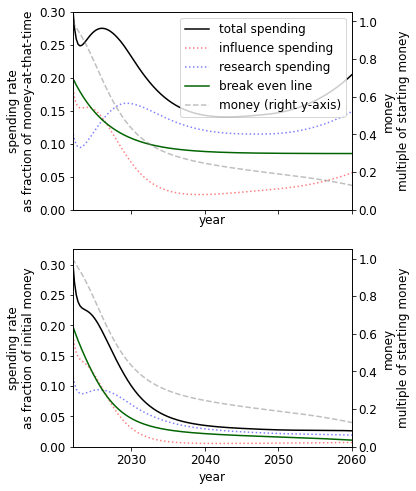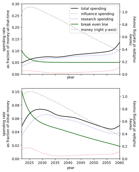 - Of all simple spending schedules that consider two regimes: now until 2030, 2030 onwards, the best strategy is to spend ~8% per year until 2030, and ~6% afterwards.
